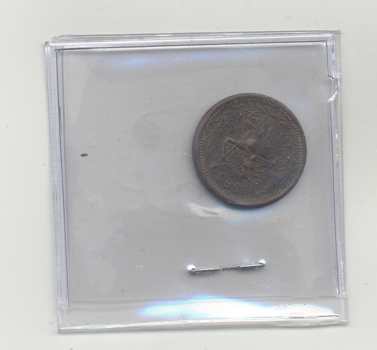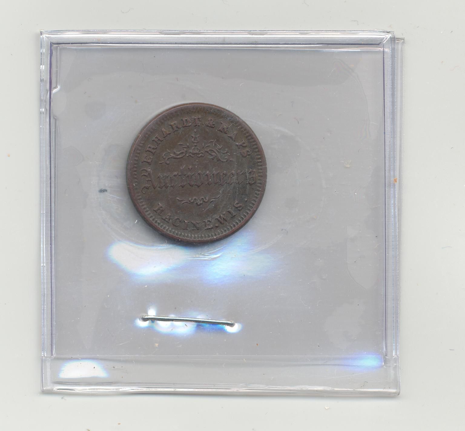 COIN, ADVERTISING, 1863, ERHARDT & RAPS, AUCTIONEERS. RACINE, WIS. 3/4" DIAMETER