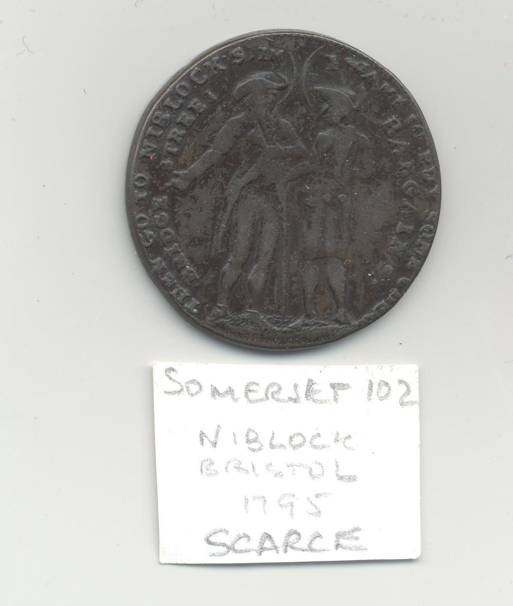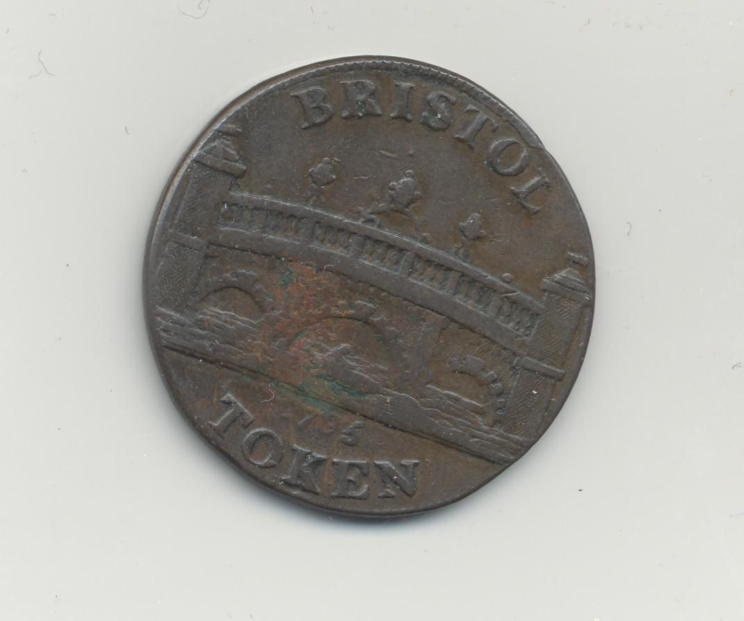 ADVERTISING COIN, 1795, BRISTOL TOKEN. SCENE OF BRIDGE ONE SIDE. OTHER SIDE TWO COLONIAL MEN, "I WANT TO BUY SOME CHEAP BARGAINS." "THEN GO TO NIBLOCK'S IN BRIDGE STREET." 1" DIAMETERCreated By