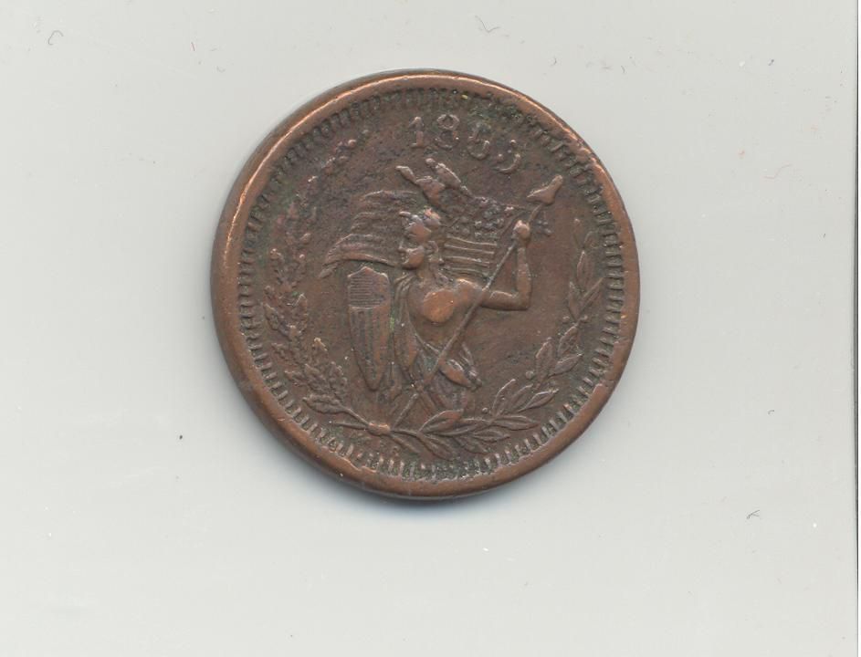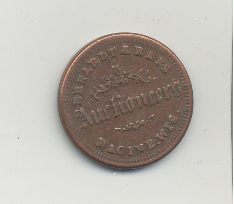 ADVERTISING COIN, 1865, WI. ERHARDT & RAPS, AUCTIONEERS. 3/4" DIAMETER