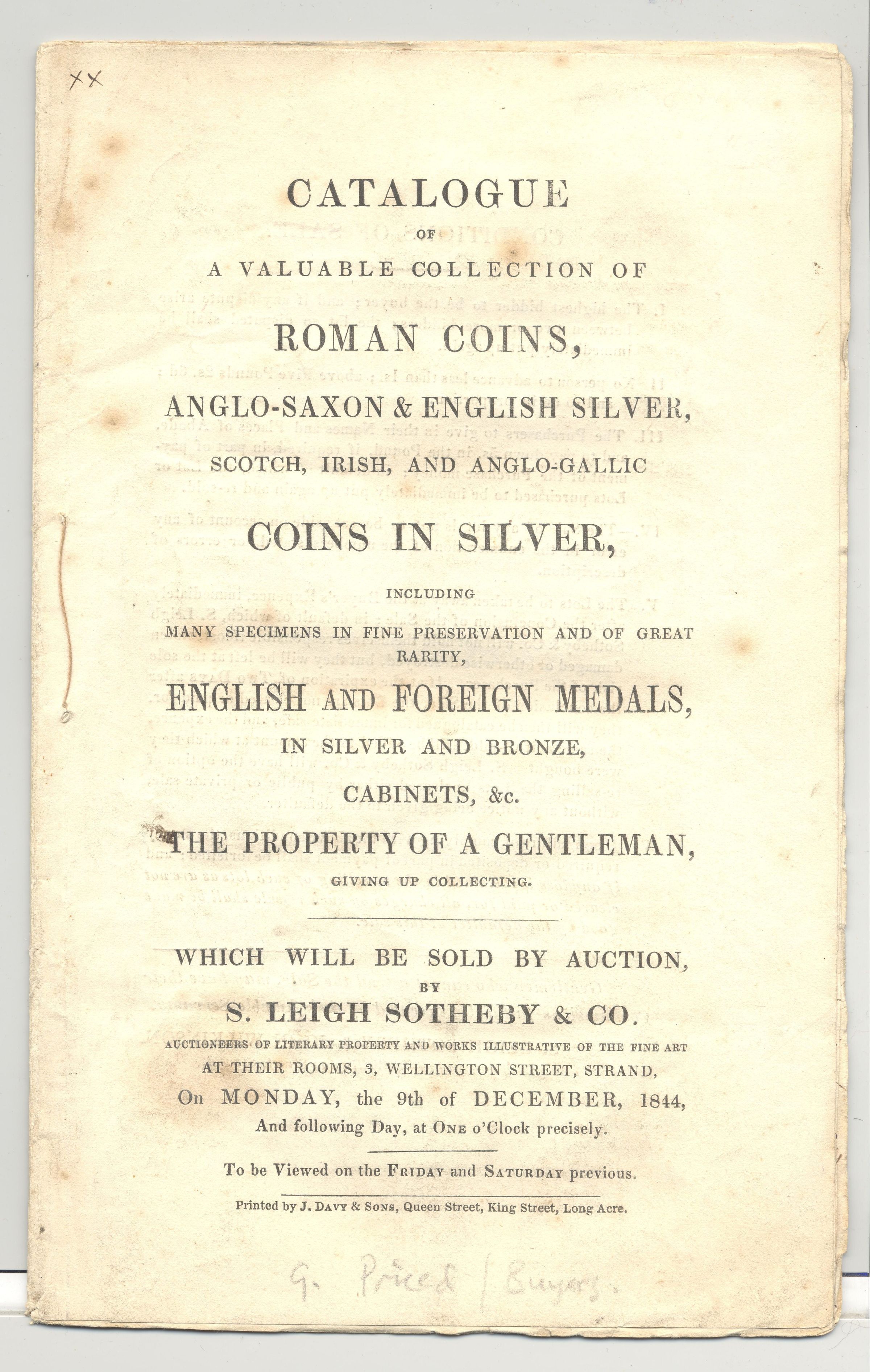 CAT, COINS, 1844, STRAND. ROMAN COINS, ANGLO-SAXON & ENGLISH SILVER, ENGLISH & FOREIGN MEDALS, ETC. S. LEIGH SOTHEBY & CO., AUCTIONEERS. PRICED, 17 PP. 5 3/4" X 9"Created By