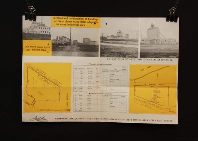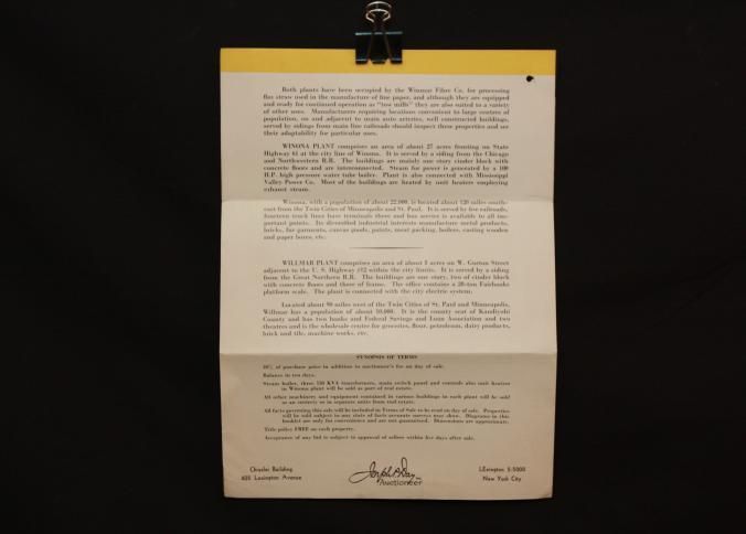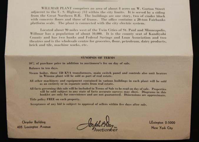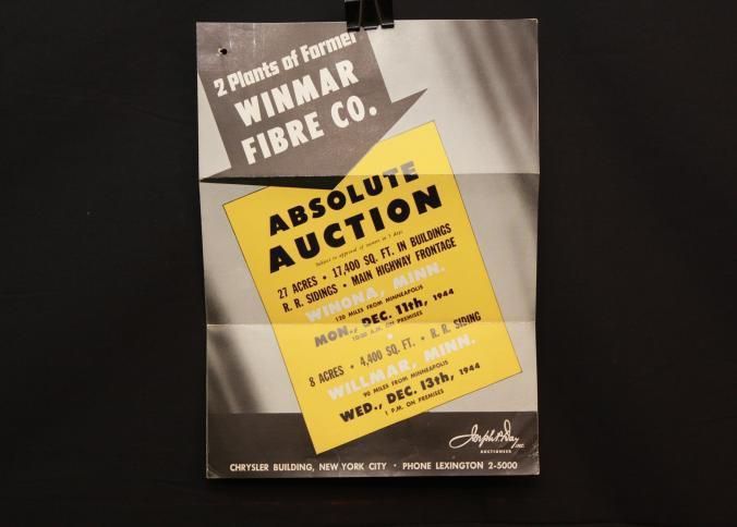 FLYER, 1944, REAL ESTATE, MN. 2 PLANTS OF FORMER WINMAR FIBRE CO. ABSOLUTE AUCTION. MAPS, B/W PHOTOS, JOSEPH DAY, AUCTIONEERS. 9" X 11 1/2" FOLDED IN HALF.Created By