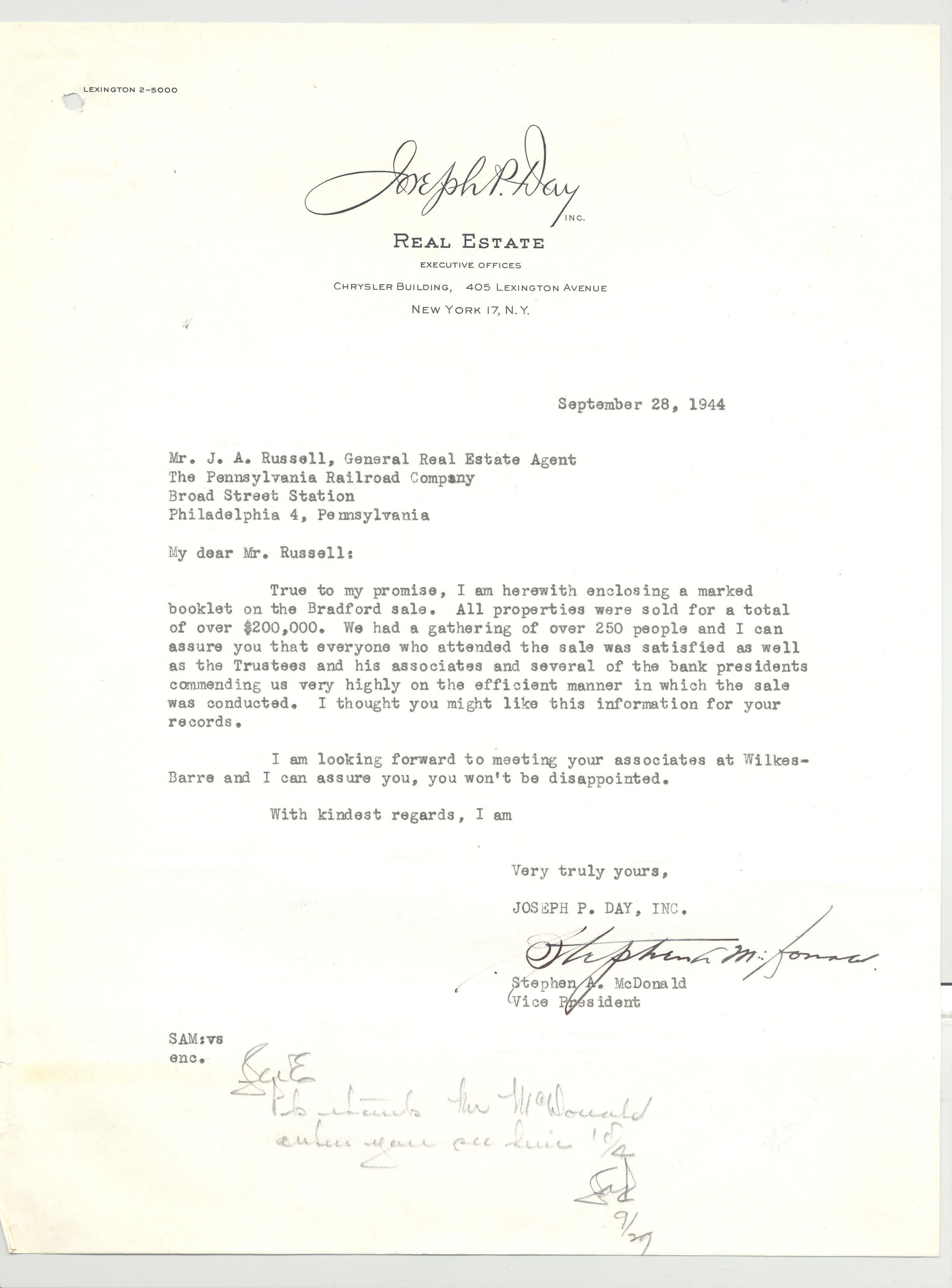 DOC, LETTER, 1944, NY. FROM JOSEPH P. DAY, INC, STEPHEN MCDONALD, AUCTIONEER. 8 1/2" X 11"