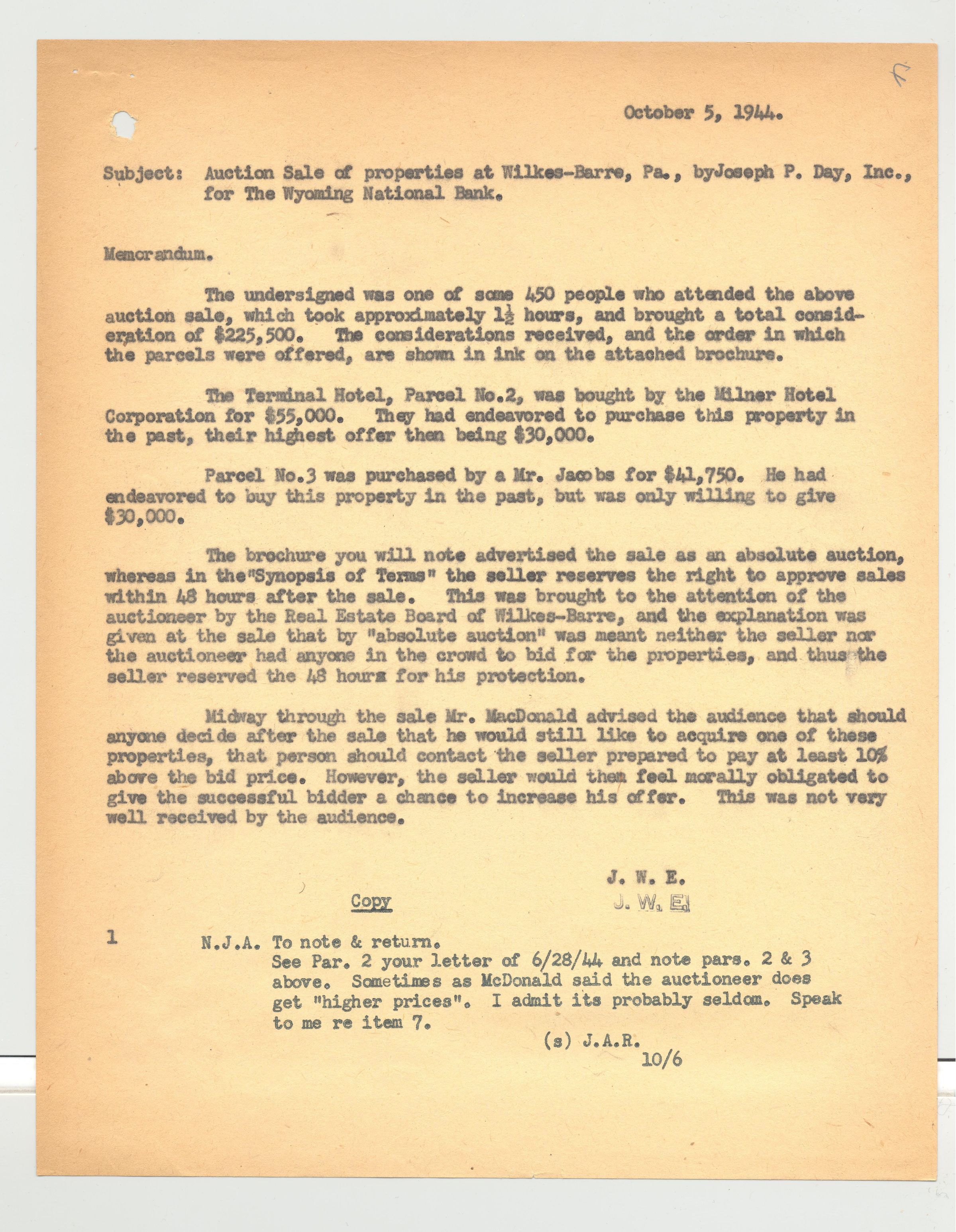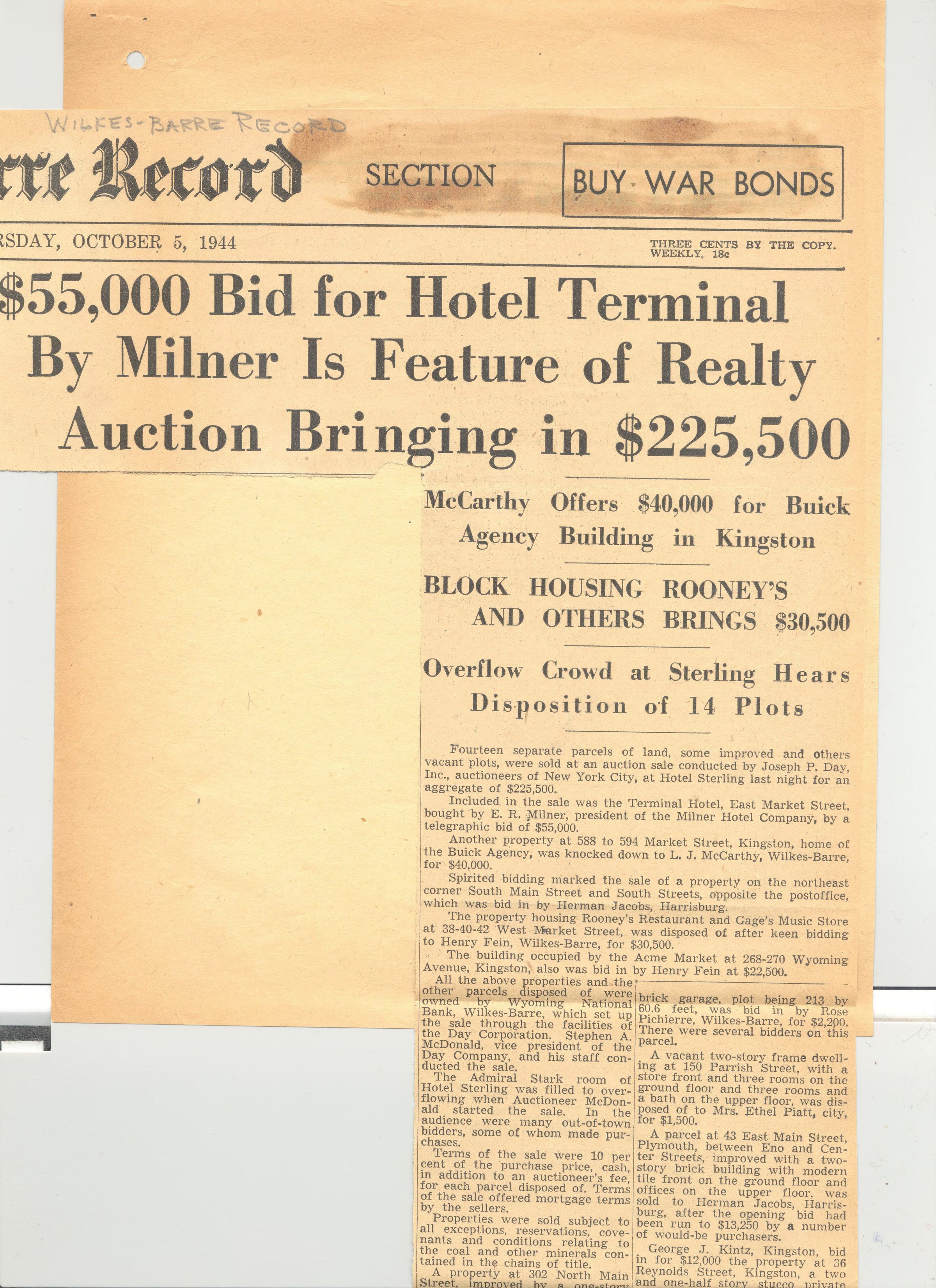 DOC, LETTER, 1944, PA. REPORT OF PRICES OF SOLD PROPERTIES IN WILKES-BARRE SALE. WITH NEWS CLIPPING QUOTING PRICES. 2 PP. 7 1/2" X 9 1/2"Created By