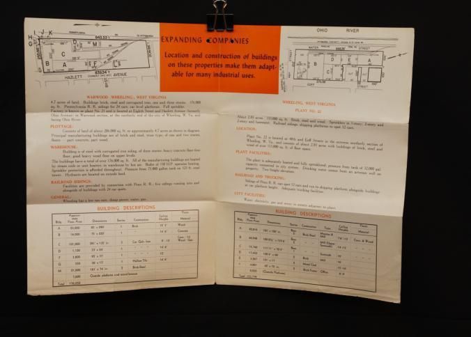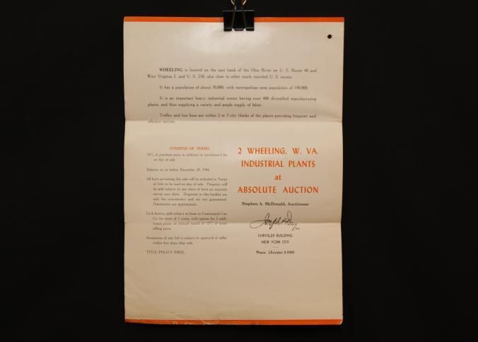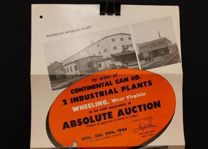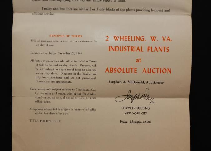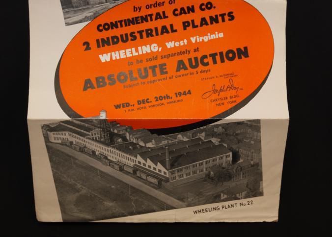 FLYER, 1944, REAL ESTATE, WV. CONTINENTAL CAN CO, 2 INDUSTRIAL PLANTS TO BE SOLD AT ABSOLUTE AUCTION. JOSEPH DAY, AUCTIONEERS. PHOTOS, TERMS, MAP. 9" X 12 FOLDEDCreated By