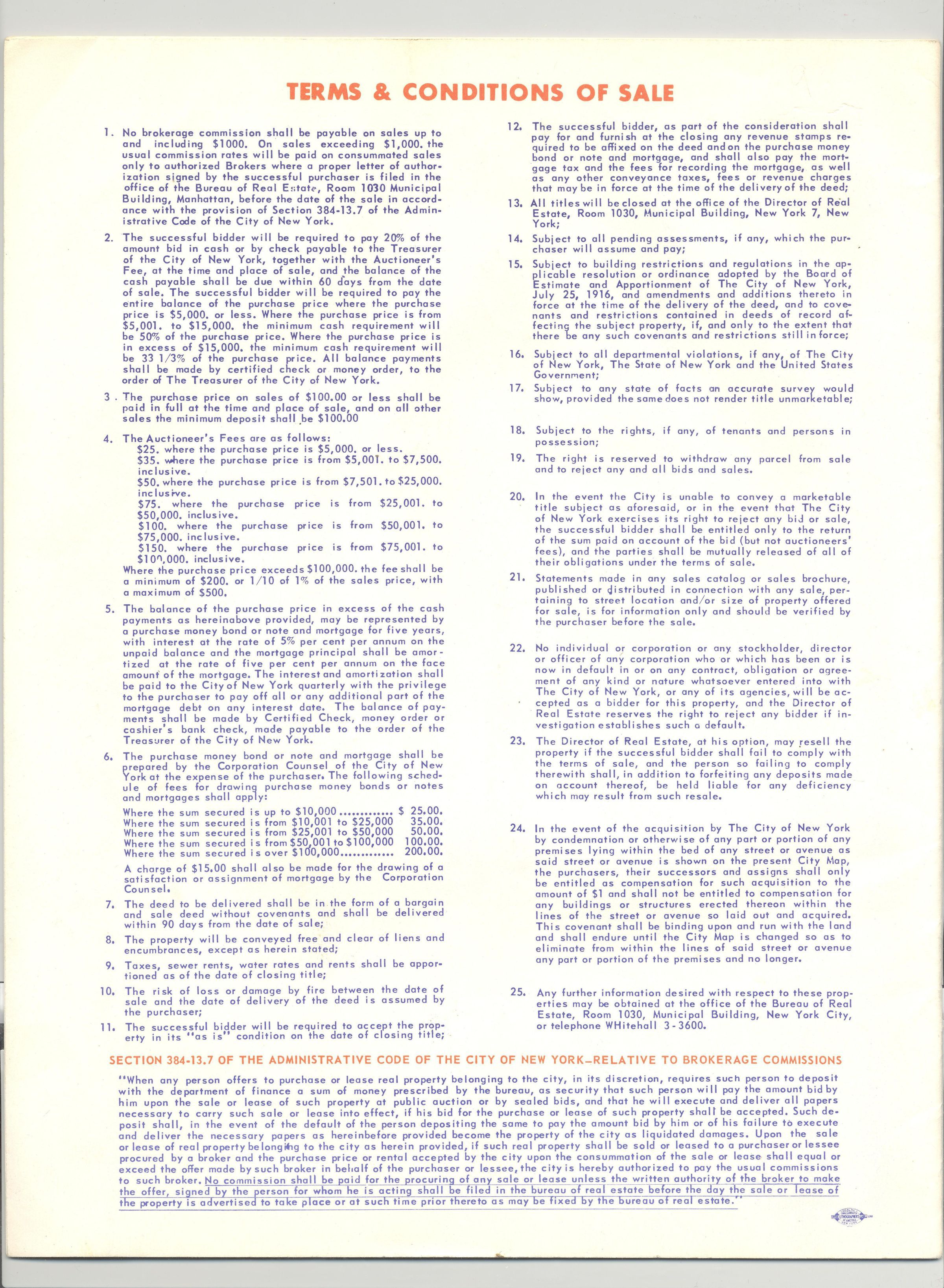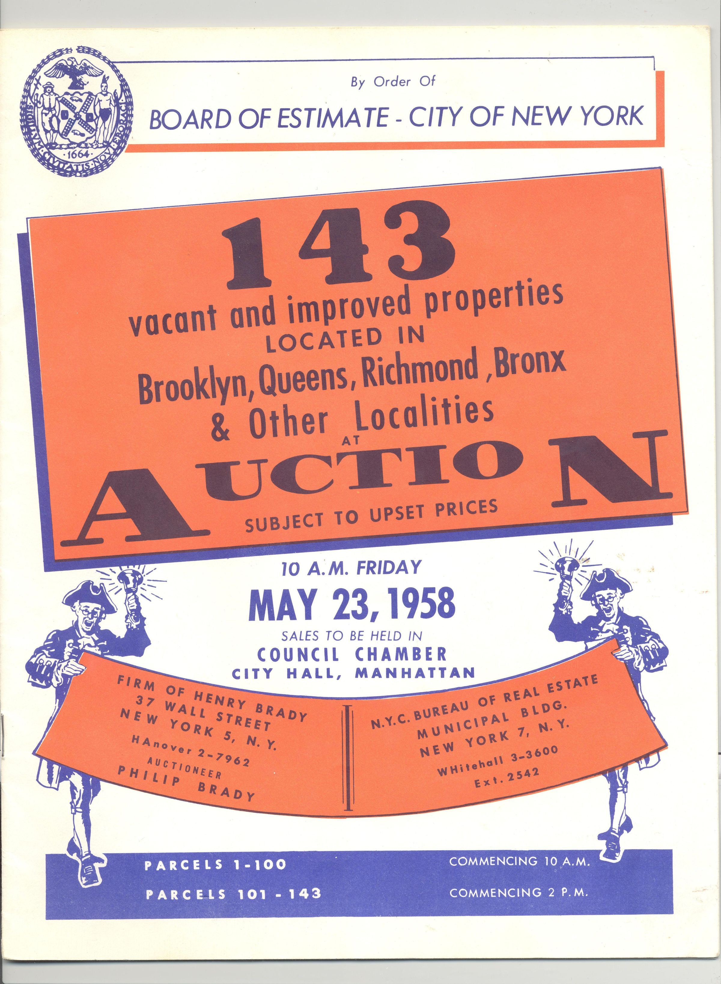 CAT, REAL ESTATE, 1958, NY CITY. 143 VACANT AND IMPROVED PROPERTIES LOCATED IN BROOKLYN, QUEENS, RICHMOND, BRONX AND OTHER LOCALITIES AT AUCTION. PHILIP BRADY, AUCTIONEER. 16 PP. 8 1/2" X 11"Created By