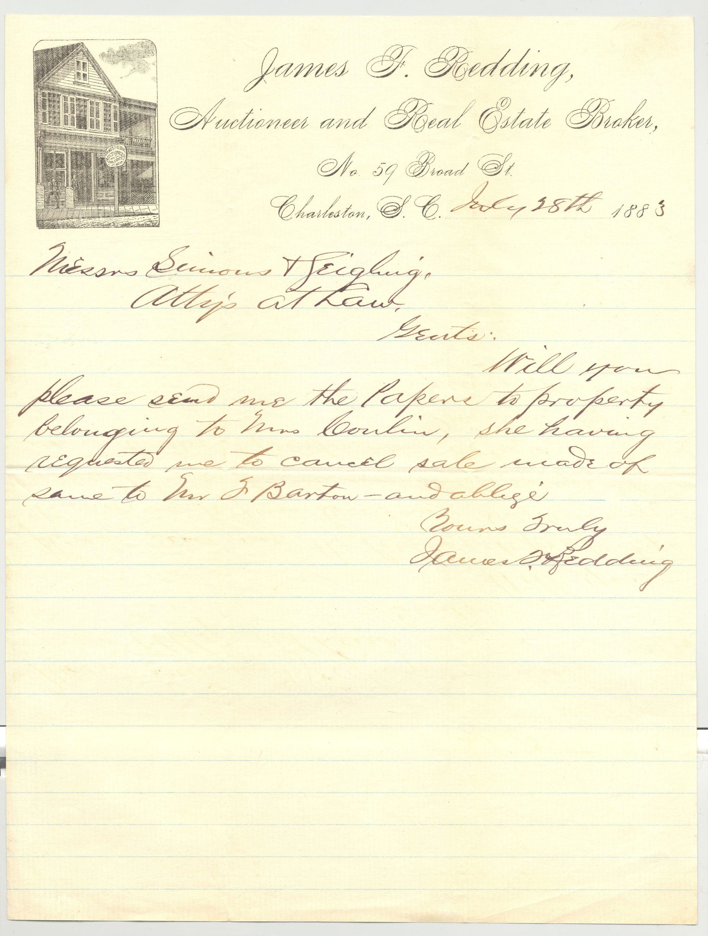 DOC, LETTERHEAD, 1883, SC. JAMES F. REDDING, AUCTIONEER AND REAL ESTATE BROKER. 8 1/2" X 11"