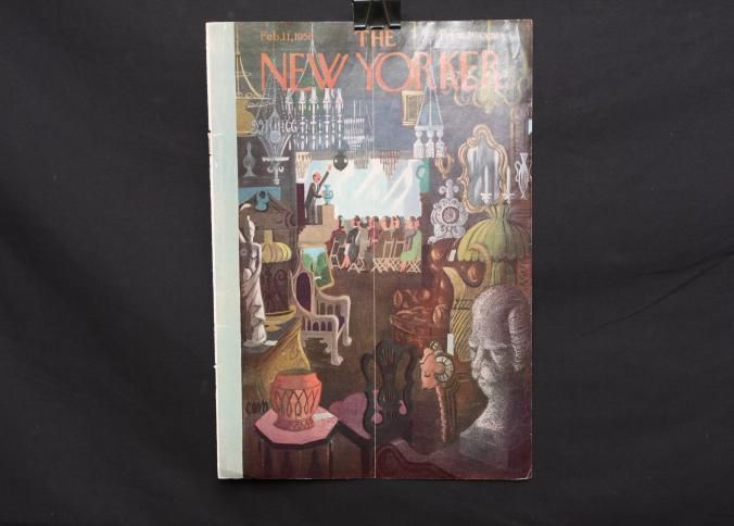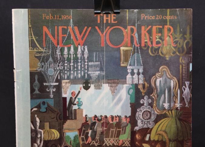 MAG COVER, THE NEW YORKER, FEB. 1956. COLOR ILLUS OF ANTIQUES AUCTION. 8 3/4" X 11 1/2"