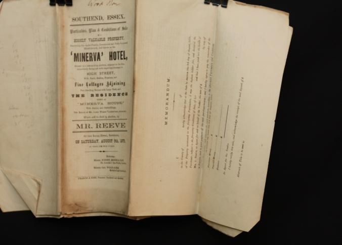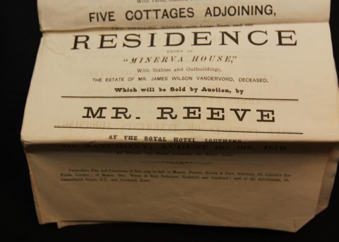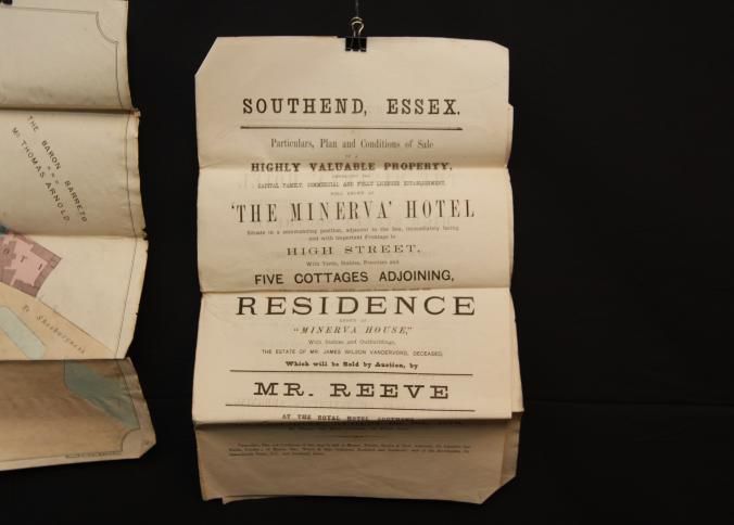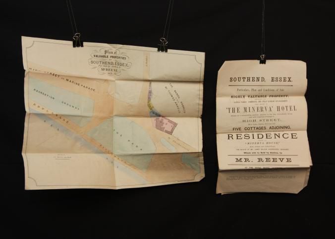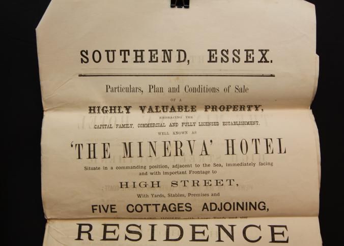 PARTICULARS, 1879, SOUTHEND, ESSEX. "THE MINERVA" HOTEL. MR. REEVE, AUCTIONEER. 6 PP AND MAP INCL. 11" X 17 1/4"Created By