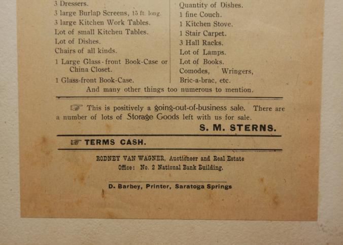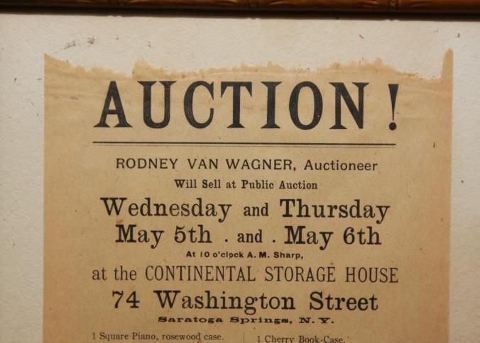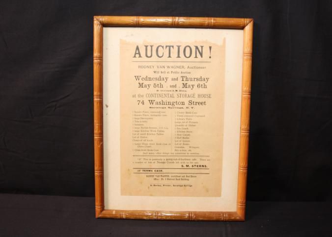 FR. 19THC STORAGE AUCTION BROADSIDE. 5 3/4X8. GOING OUT OF BUSINESS AUCTION FOR "CONTINENTAL STORAGE HOUSE 74 WASHINGTON STREET, SARATOGA SPRINGS, NY" - AUCTIONEER - RODNEY VAN WAGNER. NO DATE. GREAT LISTING OF ITEMS.Created By
