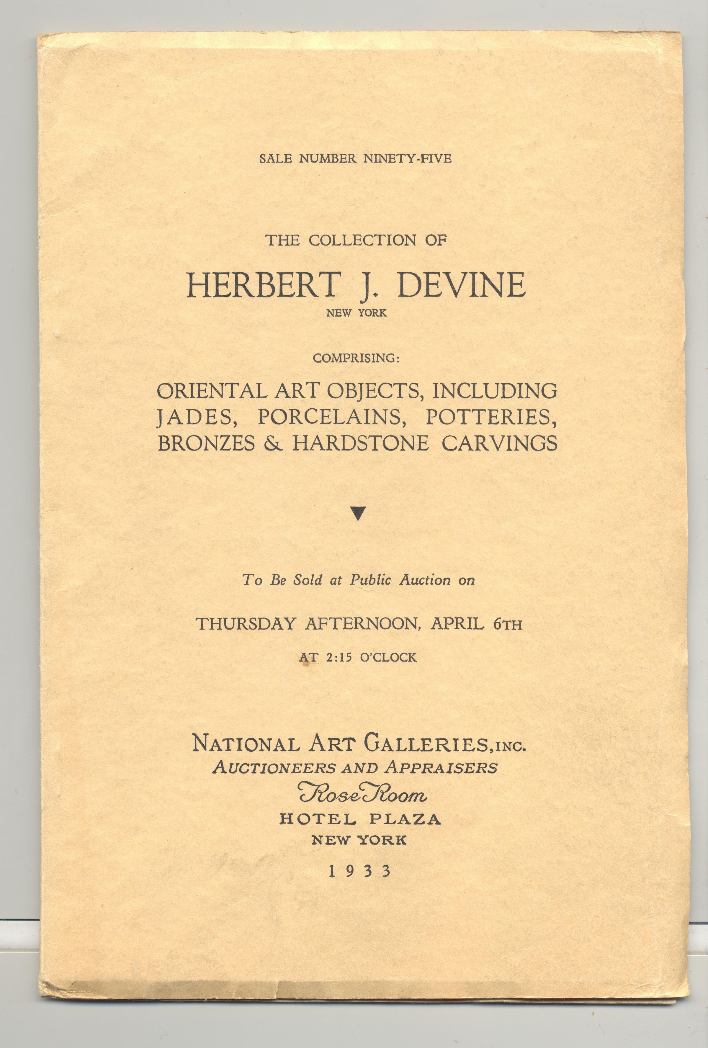 CAT, ART, 1933, NY. SALE NO. 95, COLLECTION OF HERBERT J. DEVINE, ORIENTAL ART OBJECTS. NATIONAL ART GALLERIES, INC. AUCTIONEERS. PERSONAL NOTE FROM CONSIGNOR ON FIRST PAGE. ILLUS, 60 PP. 6 1/4" X 9 1/4"Created By
