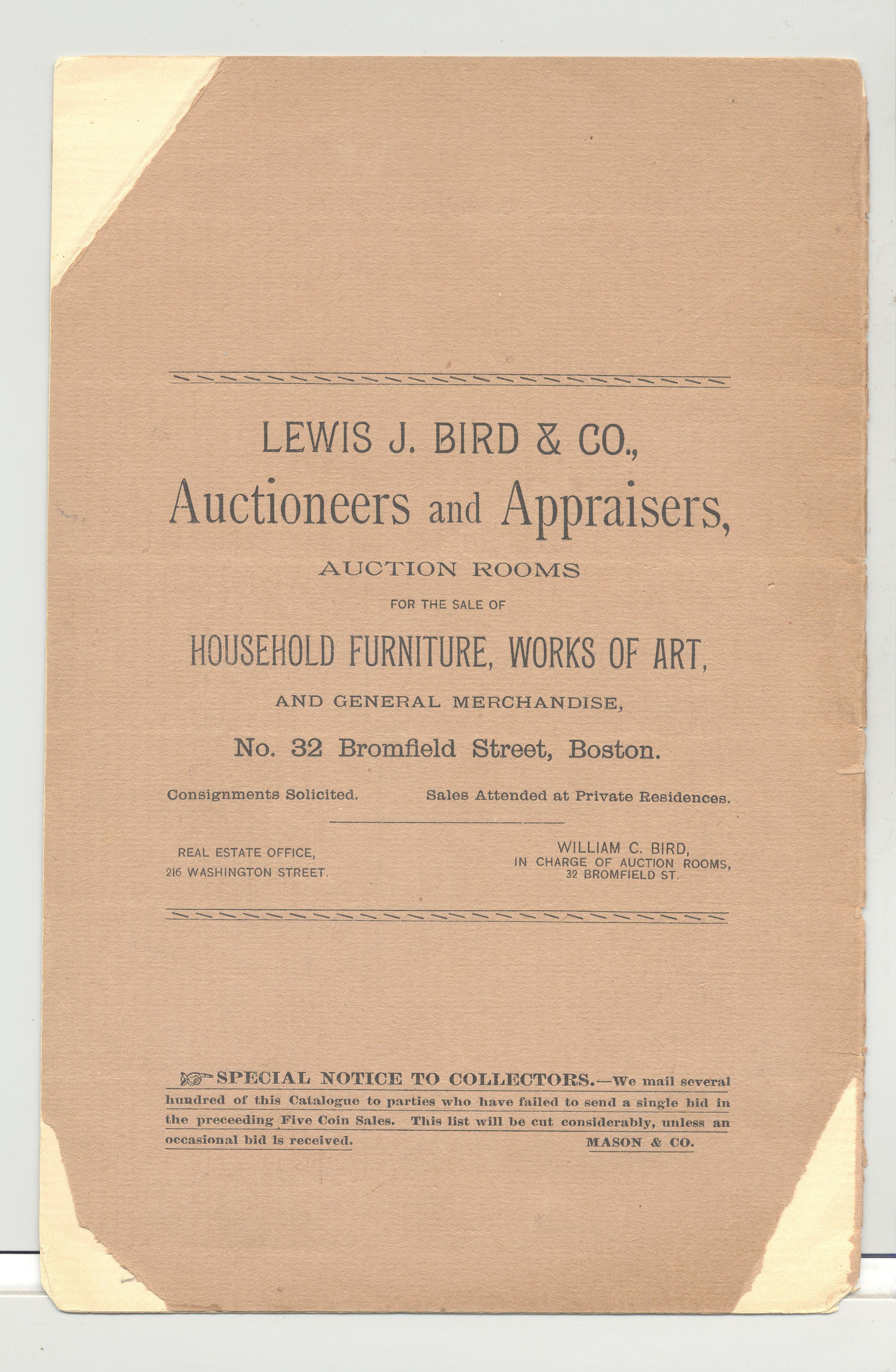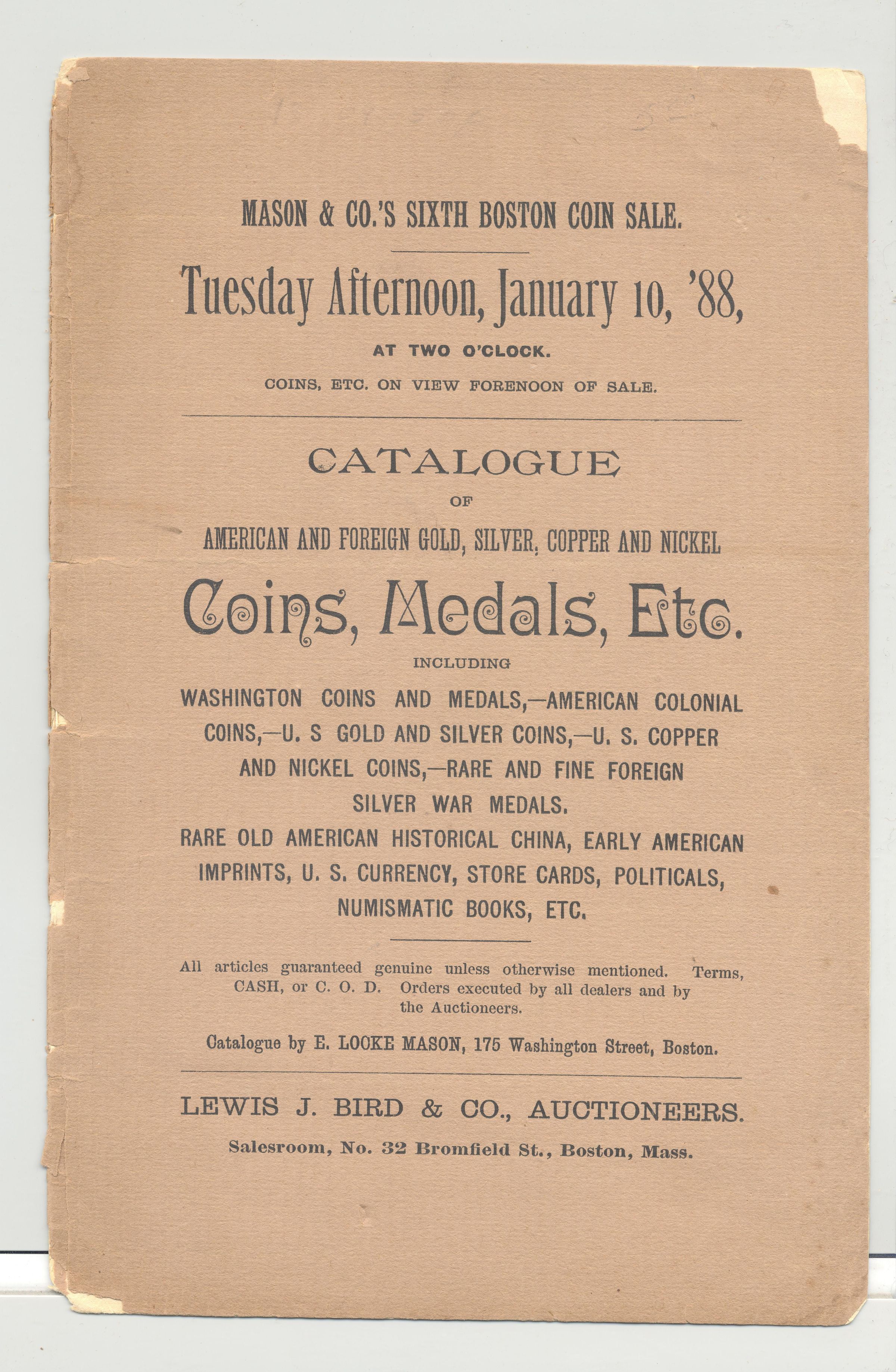 CAT, COINS, 1888, MA. MASON & CO'S SIXTH BOSTON COIN SALE, LEWIS BIRD & CO, AUCTIONEERS. PAGES MISSING, PRICED. 5 3/4" X 9"Created By