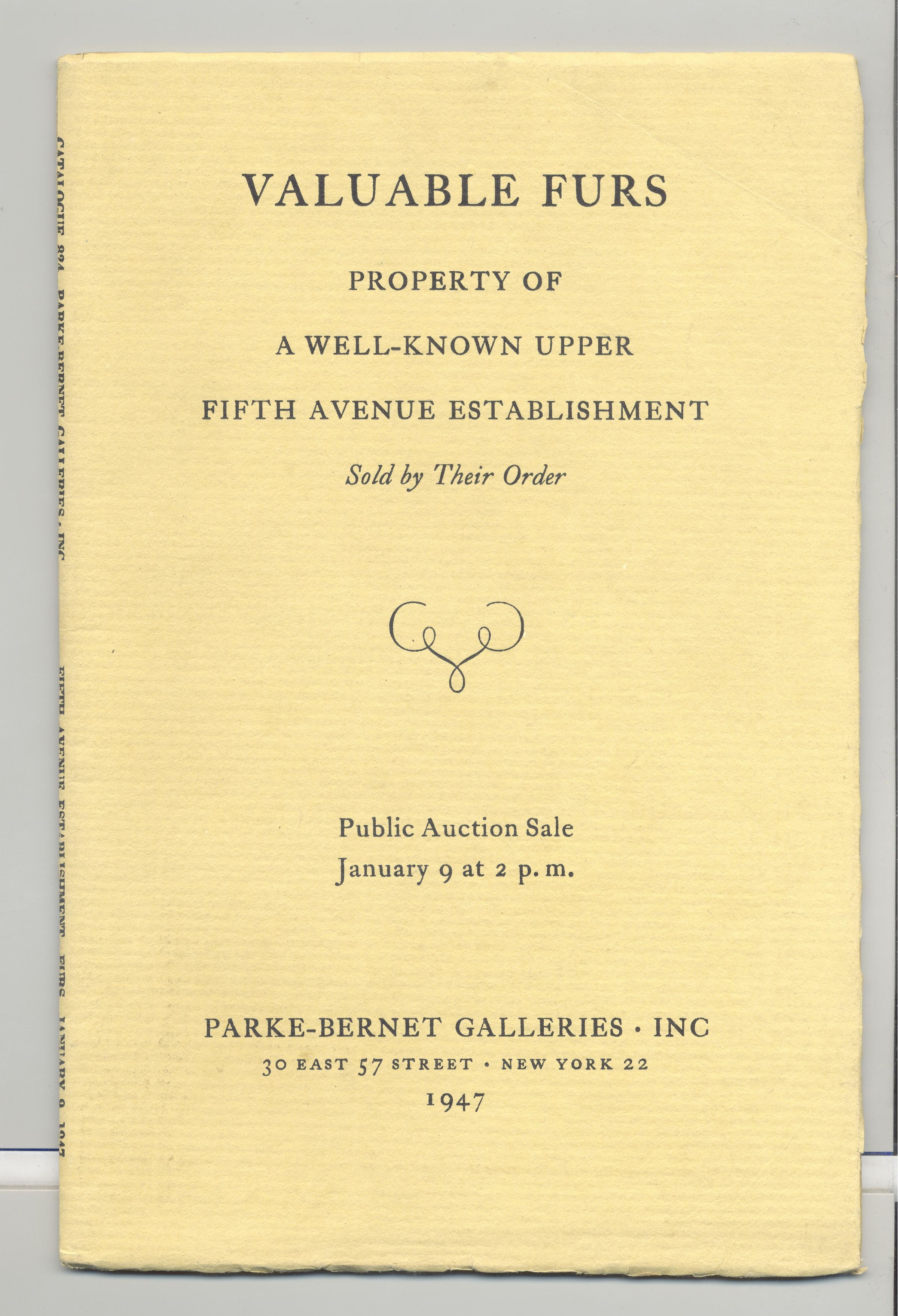 CAT, FURS, 1947, NY. VALUABLE FURS, PROPERTY OF A WELL-KNOWN UPPER FIFTH AVE ESTABLISHMENT. PARKE-BERNET GALLERIES, INC. B/W PHOTOS, 39 PP. 6 1/4" X 9 1/4"Created By