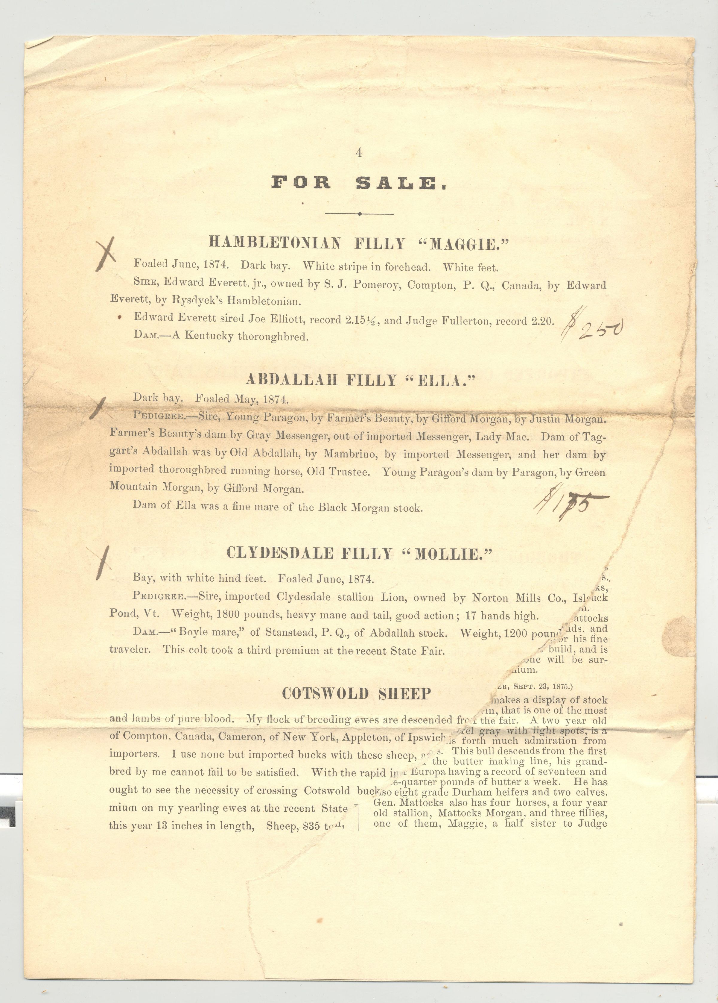 CAT, LIVESTOCK, 1875, ME. STOCK, SWINE & POULTRY BRED AND FOR SALE BY CHAS. P. MATTOCKS. PAGE MISSING. 4 PP, ILLUS OF SHEEP. 7 3/4" X 10 3/4"Created By