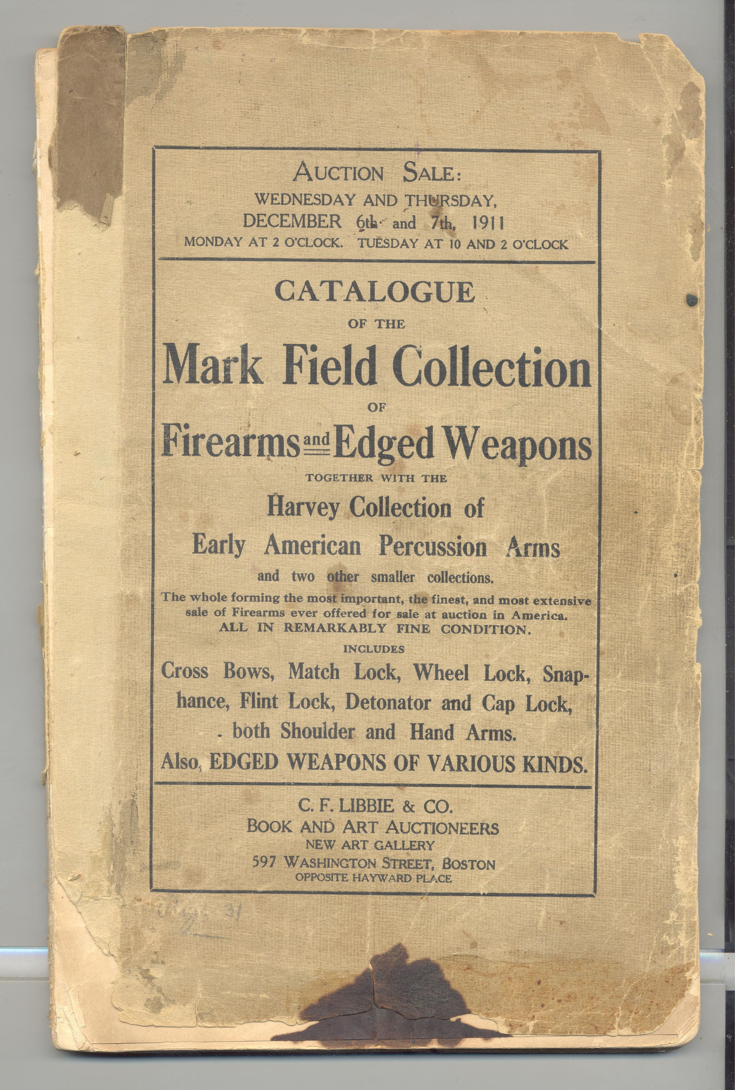 CAT, WEAPONS, 1911, MA. MARK FIELD COLLECTION OF FIREARMS & EDGED WEAPONS, W/HARVEY COLLECTION OF EARLY AMERICAN PERCUSSION ARMS. C.F. LIBBIE & CO, AUCTIONEERS. PRICED, 90 PP. 6" X 9 1/2"Created By