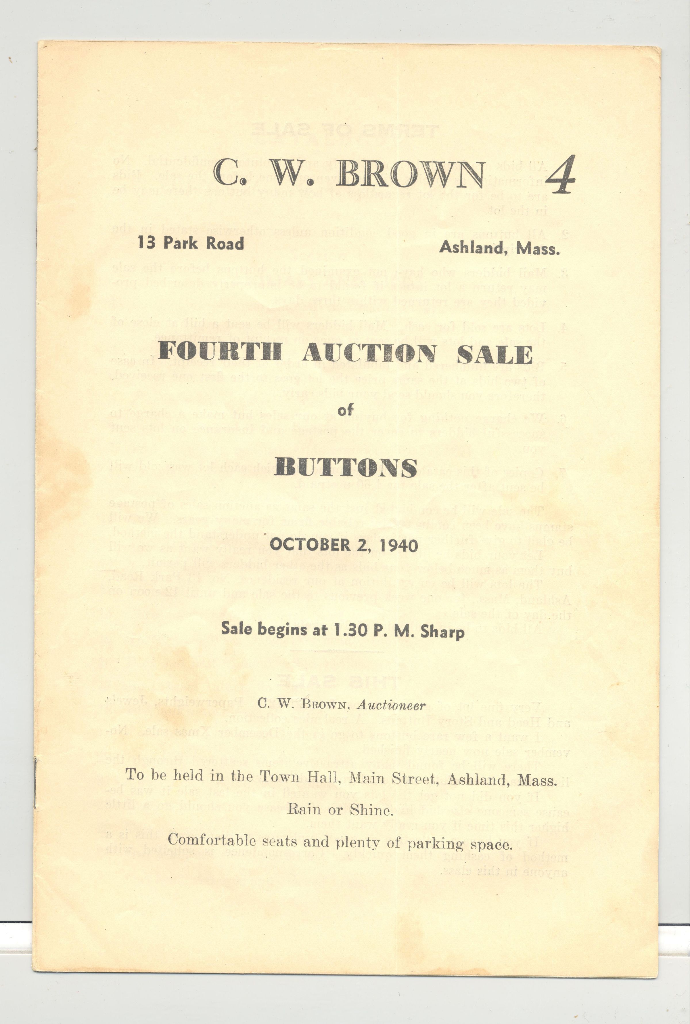 CAT, BUTTONS, 1940, MA. FOURTH AUCTION SALE OF BUTTONS BY C.W. BROWN, AUCTIONEER. 16 PP. 6" X 9"Created By