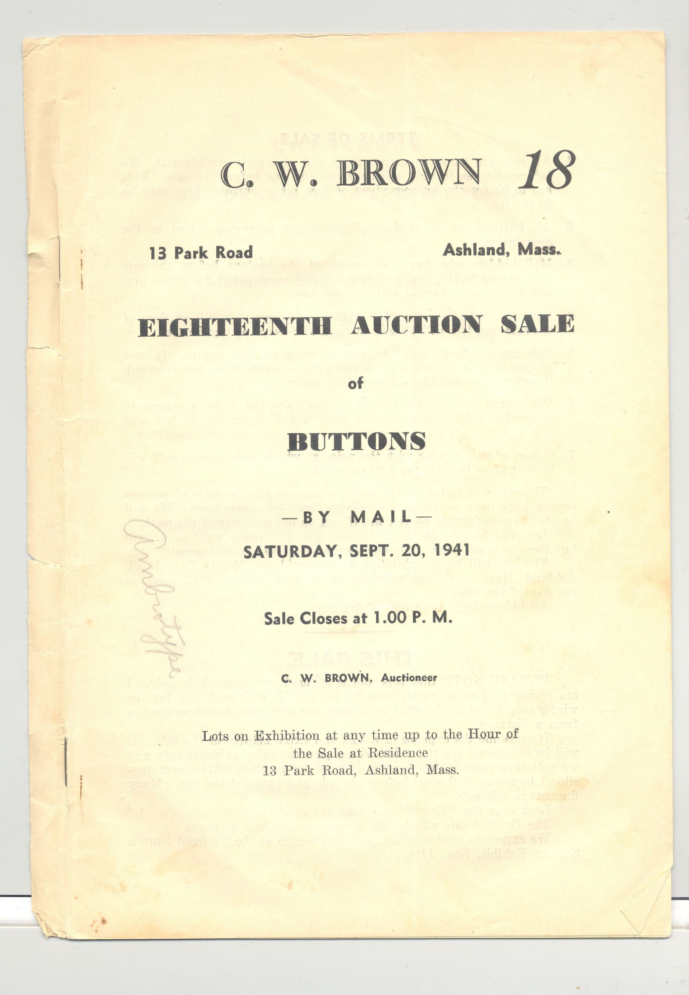 CAT, BUTTONS, 1941, MA. 18TH AUCTION SALE OF BUTTONS BY C.W. BROWN, AUCTIONEER. BY MAIL. SOME PRICES, 18 PP. 6" X 9"Created By