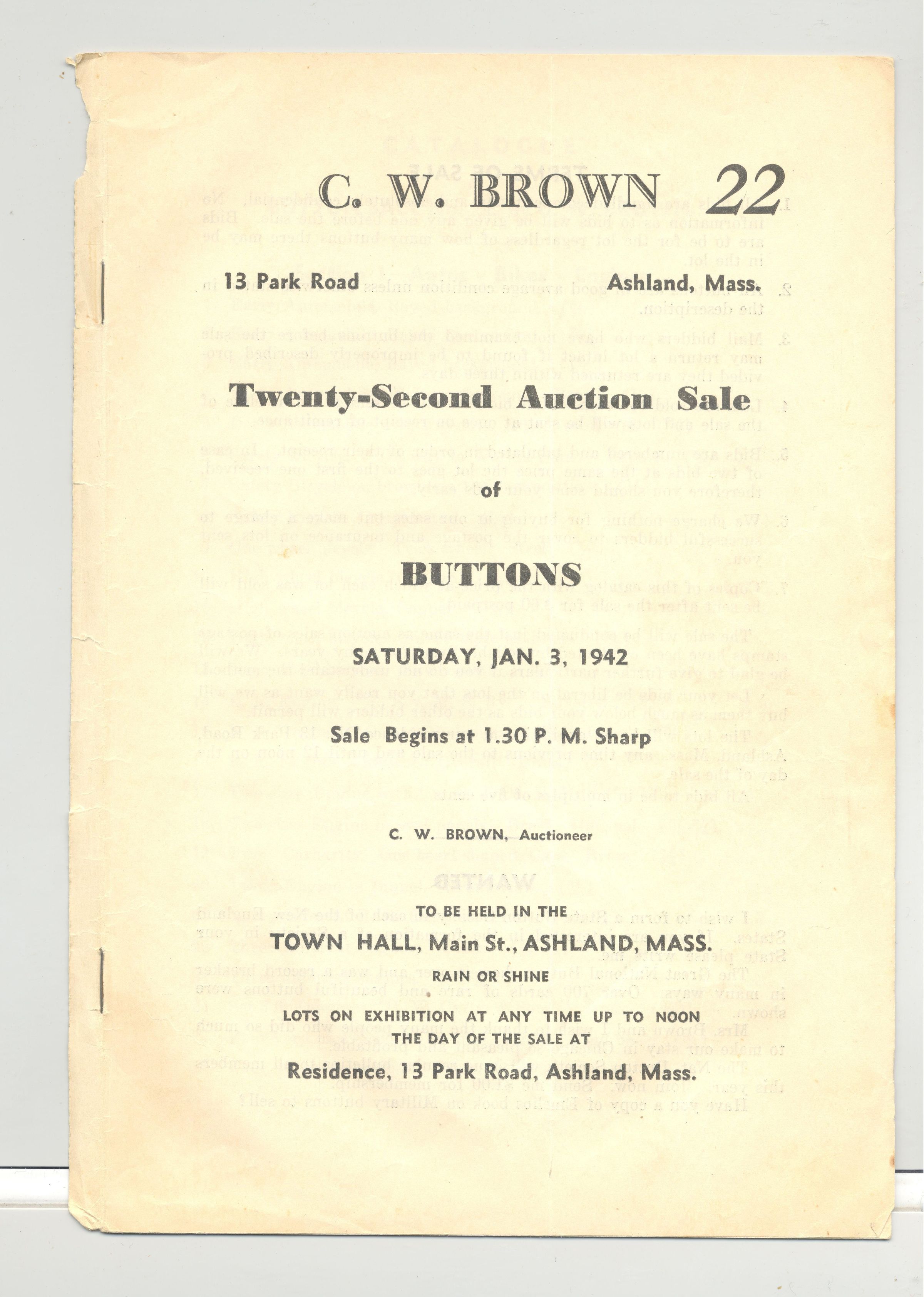 CAT, BUTTONS, 1942, MA. 22ND AUCTION SALE OF BUTTONS BY C.W. BROWN, AUCTIONEER. 18 PP, SOME PRICES, 6" X 9"Created By