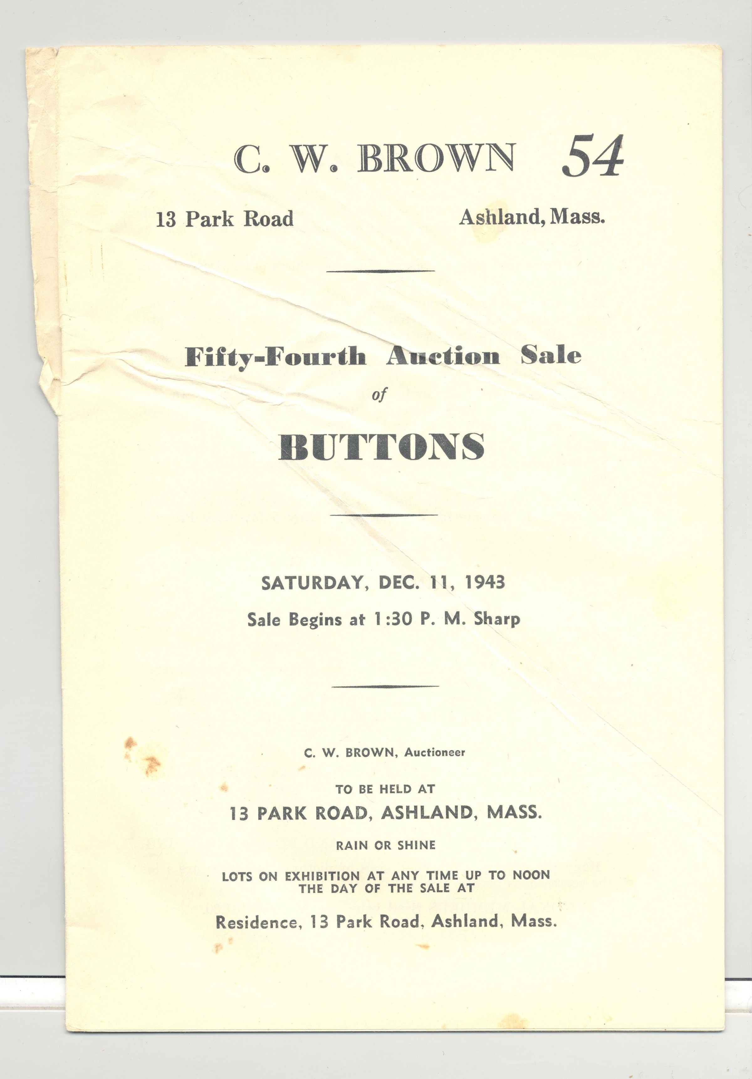 CAT, BUTTONS, 1943, MA. 54TH AUCTION SALE OF BUTTONS BY C.W. BROWN, AUCTIONEER. SOME PRICES, 18 PP. 6" X 9"Created By