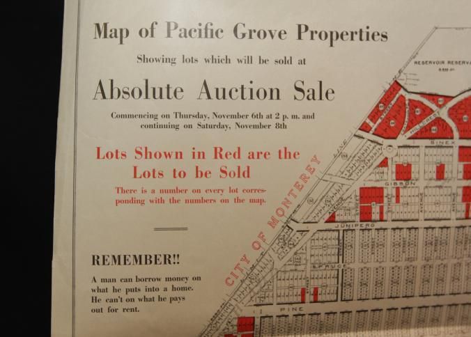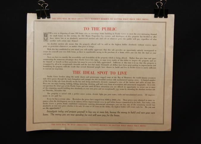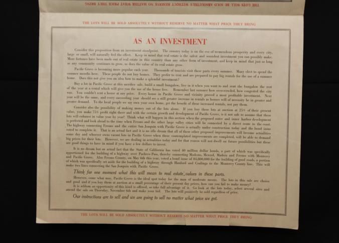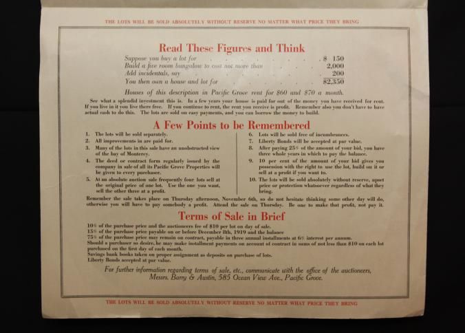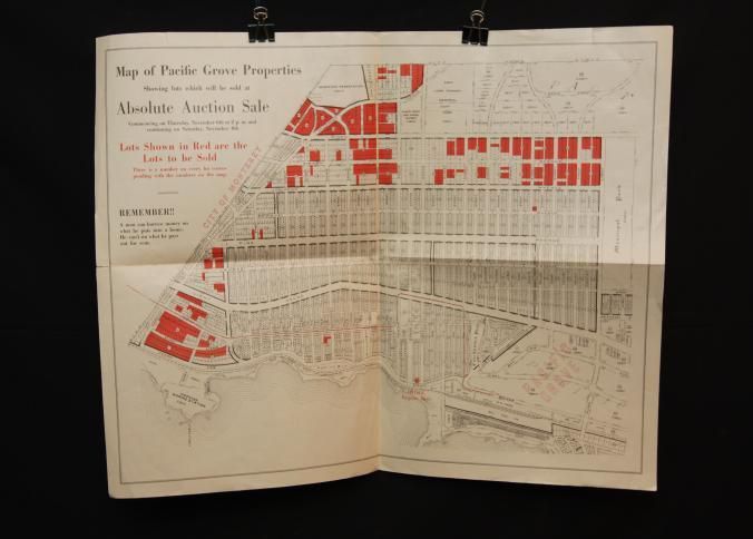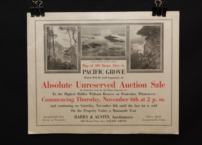 BROCHURE, REAL ESTATE, PACIFIC GROVE. 300 HOME SITES, AT ABSOLUTE UNRESERVED AUCTION. BARRY & AUSTIN, AUCTIONEERS. 28" X 21"Created By