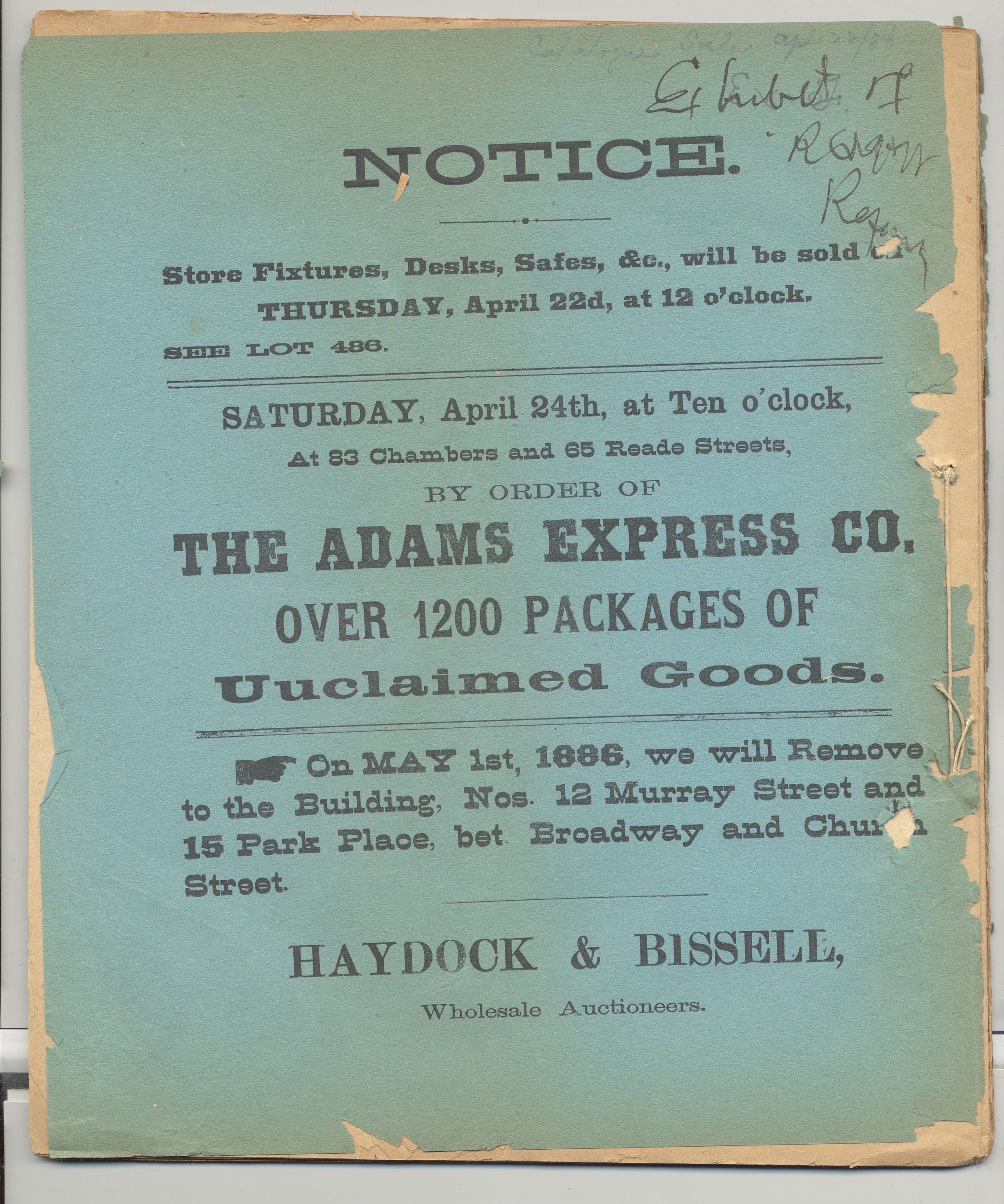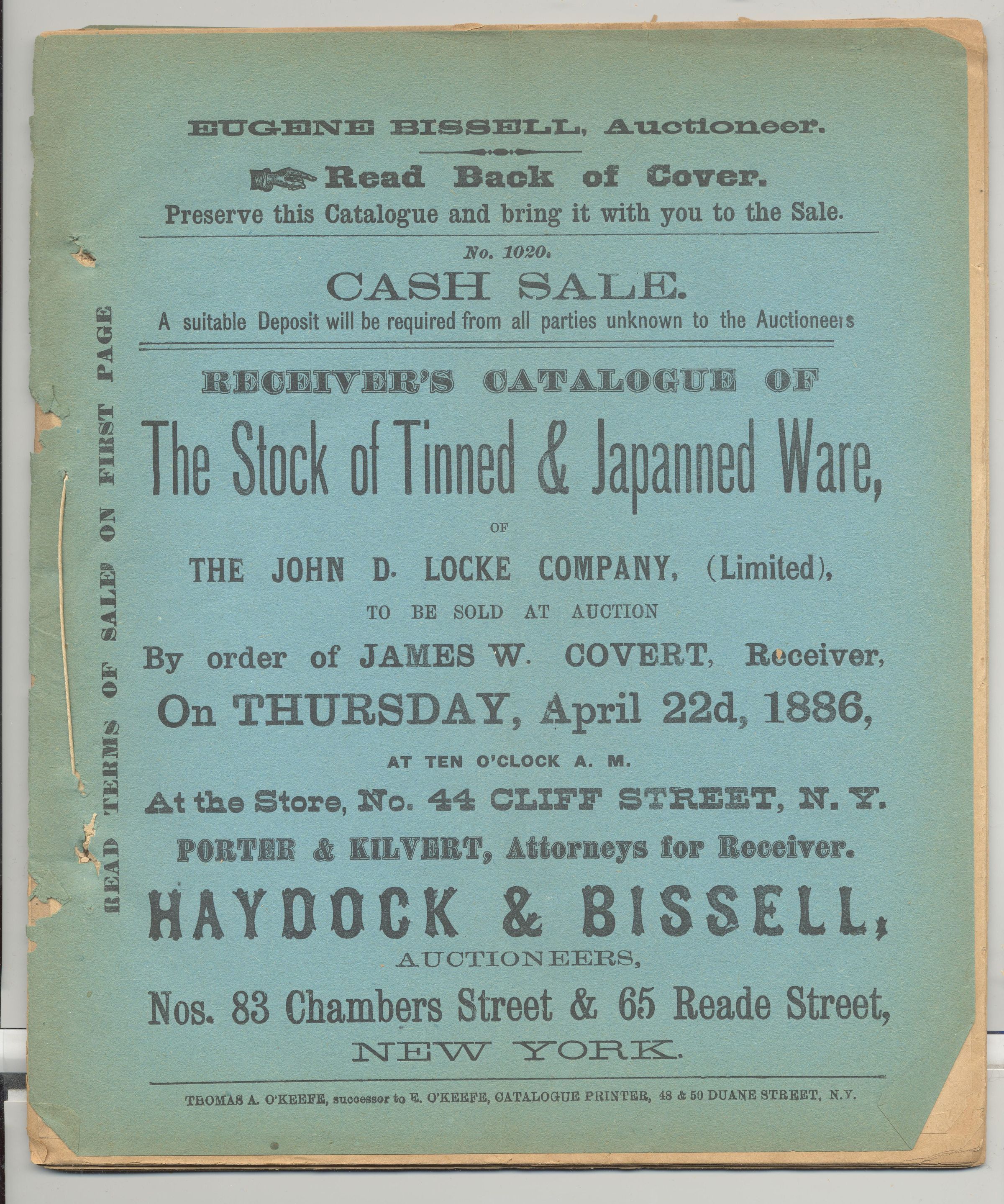 CAT, STOCK OF TINWARE, 1886, NY. EUGENE BISSELL, AUCTIONEER. RECEIVER'S CATALOGUE OF THE STOCK OF TINNED AND JAPANNED WARE OF THE JOHN D. LOCKE COMPANY, LTD. 66 PP. 8" X 9 1/2"Created By