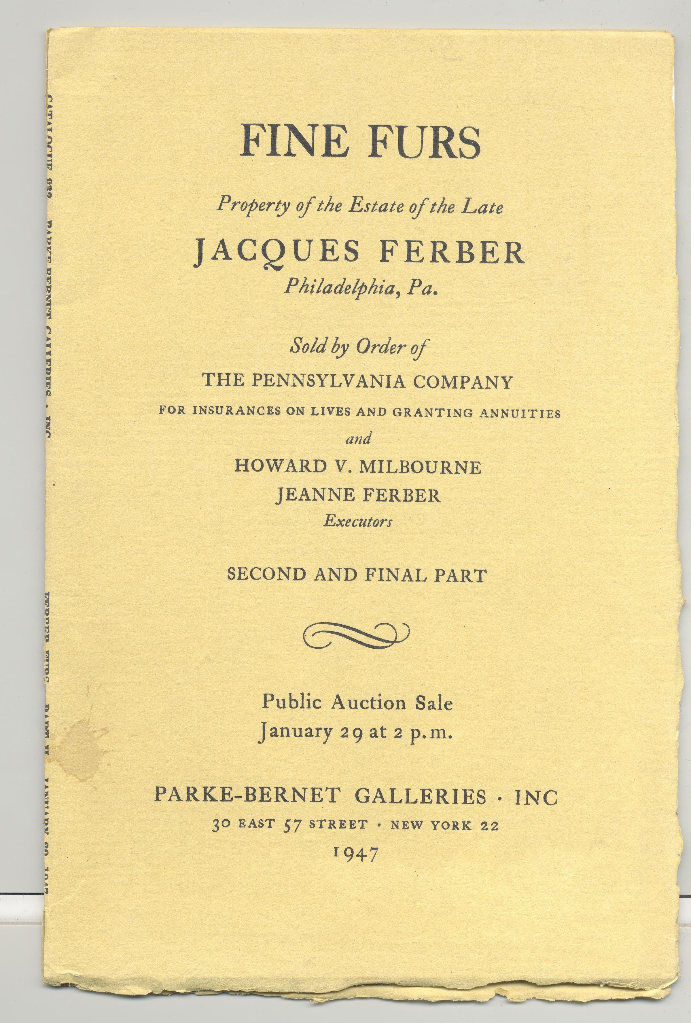 CAT, FURS, 1947, NY. FINE FURS, PROPERTY OF THE LATE JACQUES FERBER OF PHILADELPHIA, PA. SECOND AND FINAL PART. PARKE-BERNET GALLERIES, INC. ILLUS, 24 PP. 6 1/2" X 9 1/2"Created By