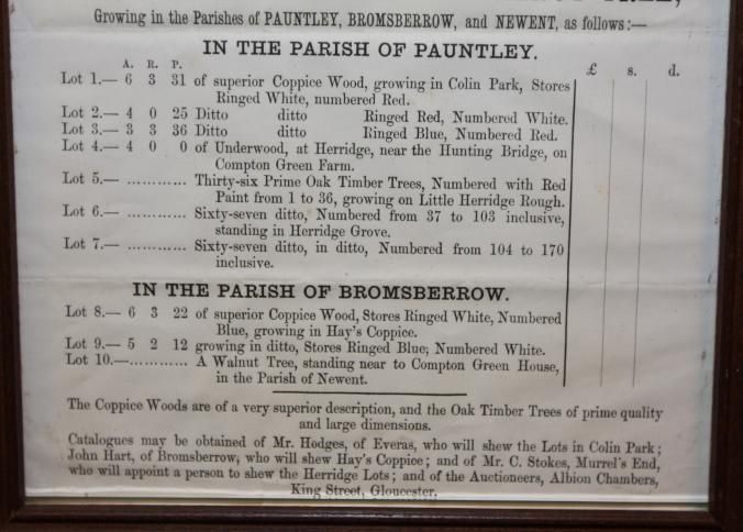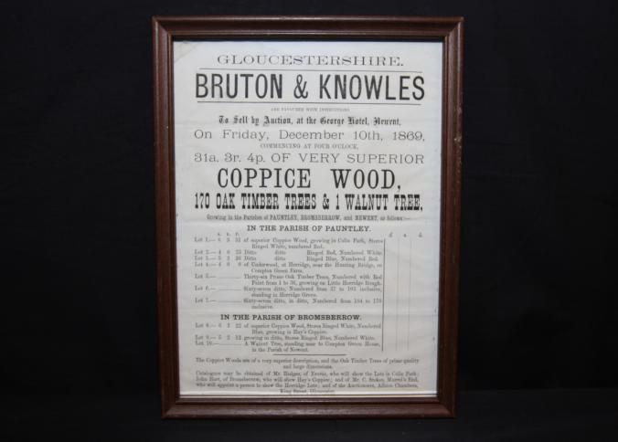 FR. 1869 WOOD TIMBER BROADSIDE. 8X10". BRUTON & KNOWLES SELLING 170 OAK TREES AND 1 WALNUT TREE AT THE GEORGE HOTEL IN NEWENT. 10 LOTS OF COPPICE WOOD. CATALOGS WERE AVAILABLE.Created By