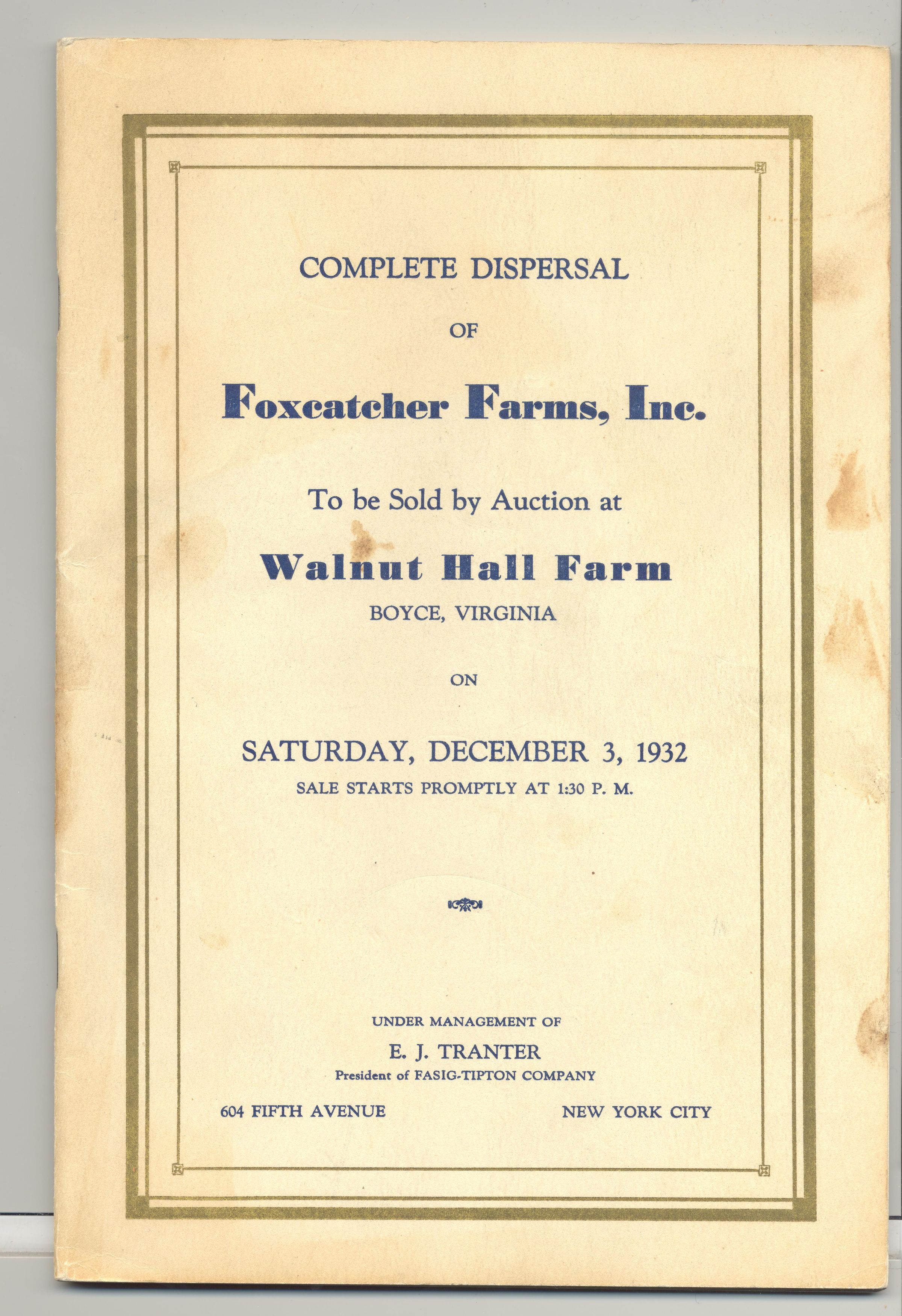CAT, LIVESTOCK, 1932, VA. COMPLETE DISPERSAL OF FOXCATCHER FARMS, INC. FASIG-TIPTON CO., AUCTIONEERS. HORSES, PRICED, 56 PP. 6" X 9"Created By