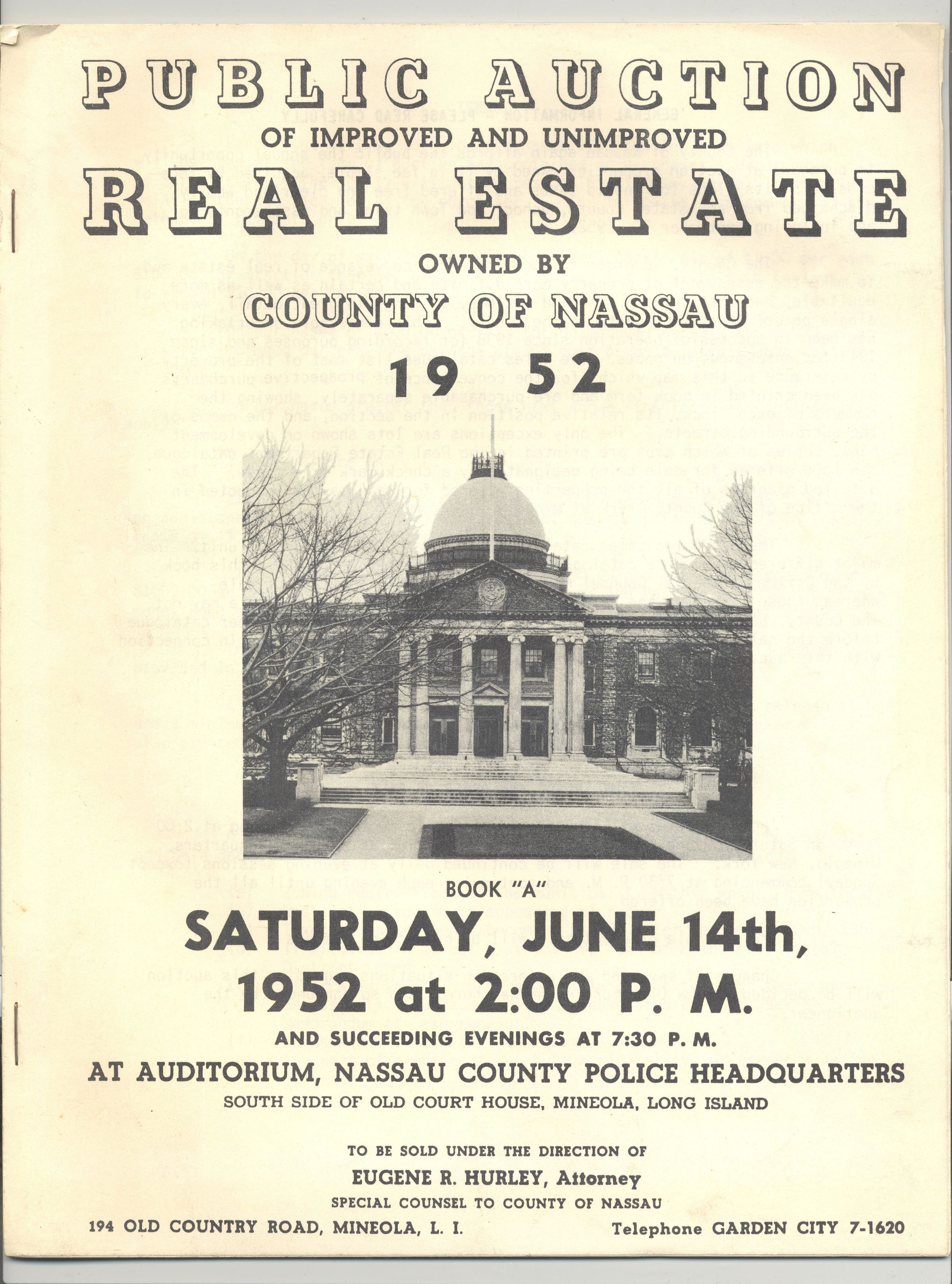 CAT, REAL ESTATE, 1952, NY. IMPROVED AND UNIMPROVED REAL ESTATE OWNED BY THE COUNTY OF NASSAU. 19 PP. ILLUS, MAP. 8 1/2" X 11"Created By