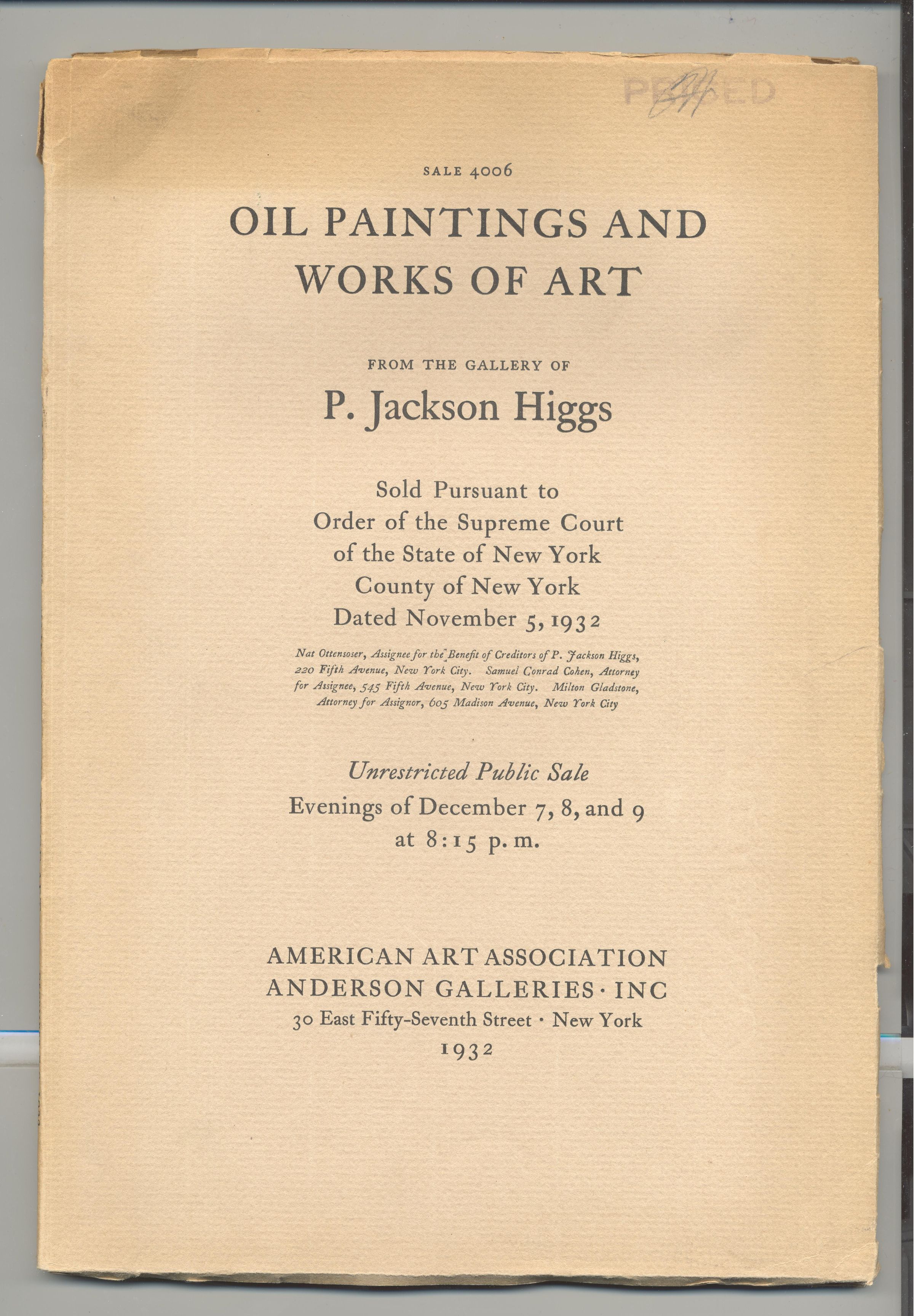 CAT, ART, 1932, NY. OIL PAINTINGS AND WORKS OF ART FROM THE GALLERY OF P. JACKSON HIGGS. AMERICAN ART ASSOC. PRICED, ILLUS, 97 PP. 7 1/2" X 10 3/4"Created By