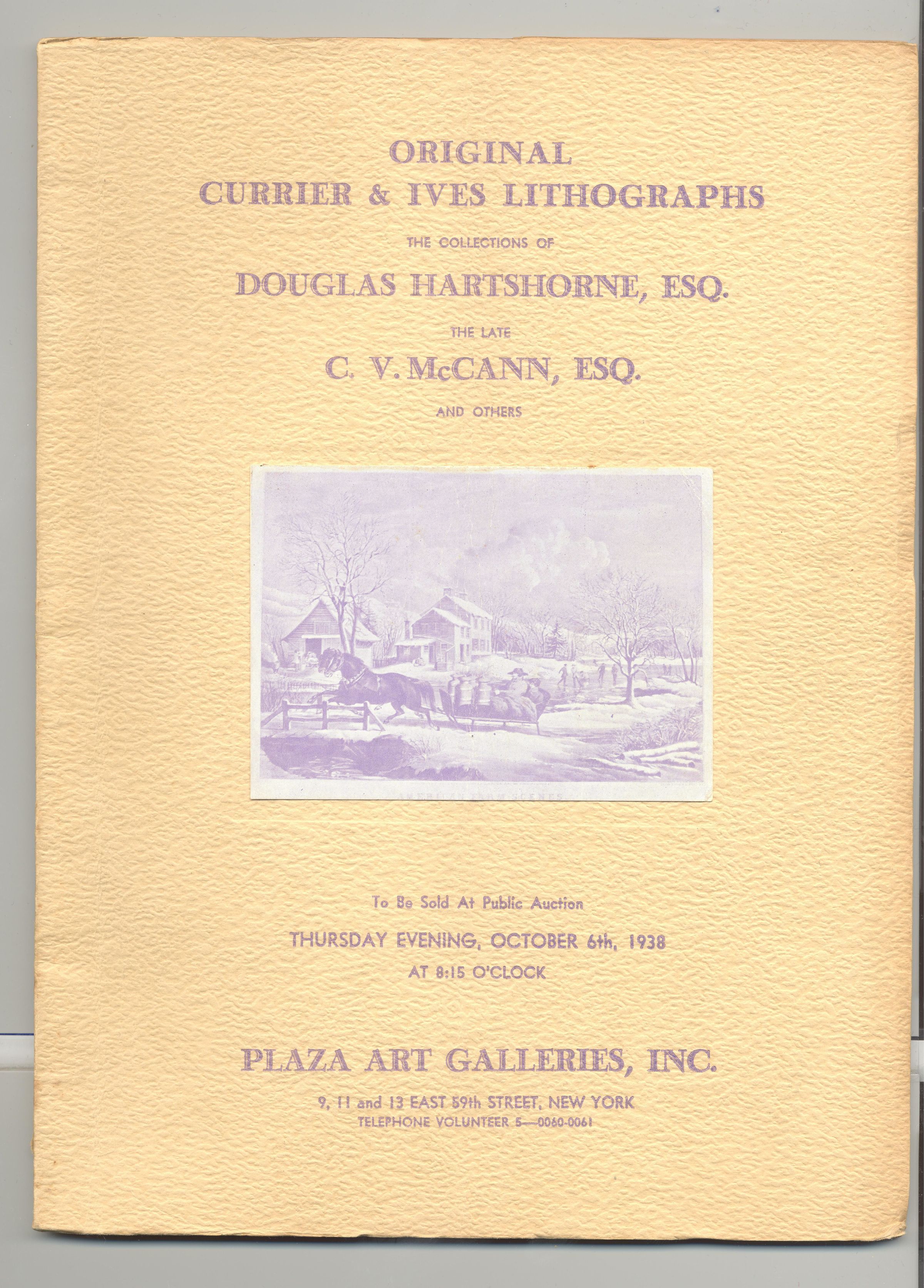 CAT, ART, 1938, NY. ORIGINAL CURRIER & IVES LITHOGRAPHS, THE COLLECTION OF DOUGLAS HARTSHORNE, ESQ. AND OTHERS. PLAZA ART GALLERIES, INC. OCT 6, 1938. ILLUS, PRICED, 52 PP. 7 1/2" X 10"Created By