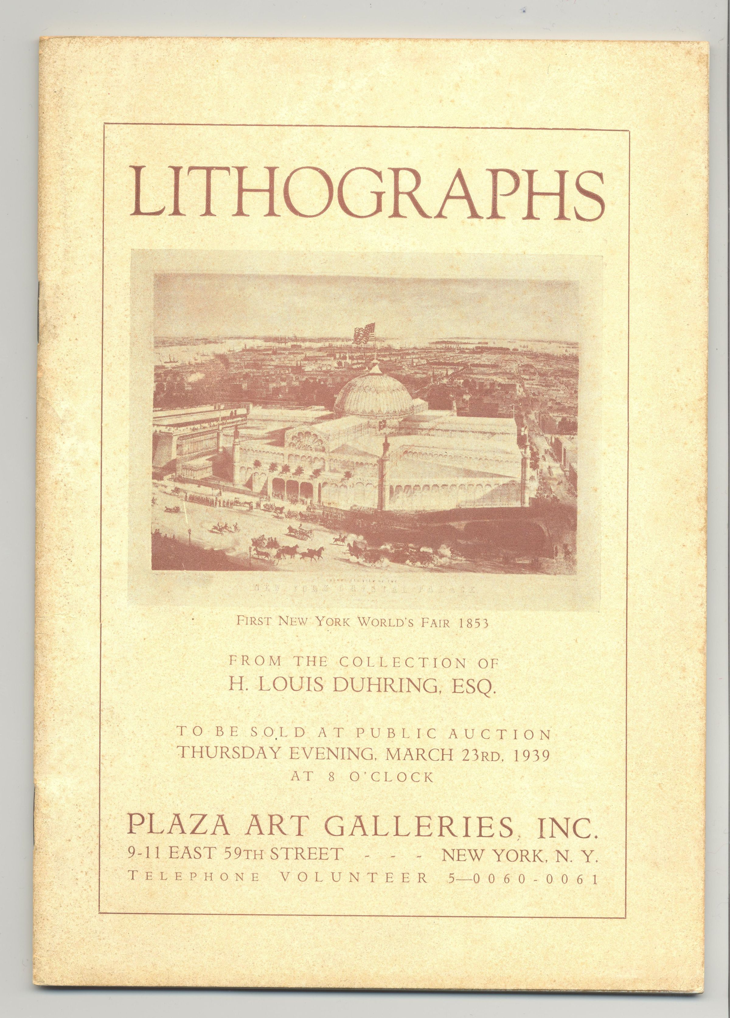 CAT, ART, 1939, NY. LITHOGRAPHS FROM THE COLLECTION OF H. LOUIS DUHRING, ESQ. PLAZA ART GALLERIES, INC. MARCH 23, 1939. ILLUS, 35 PP. 5 3/4" X 8"Created By