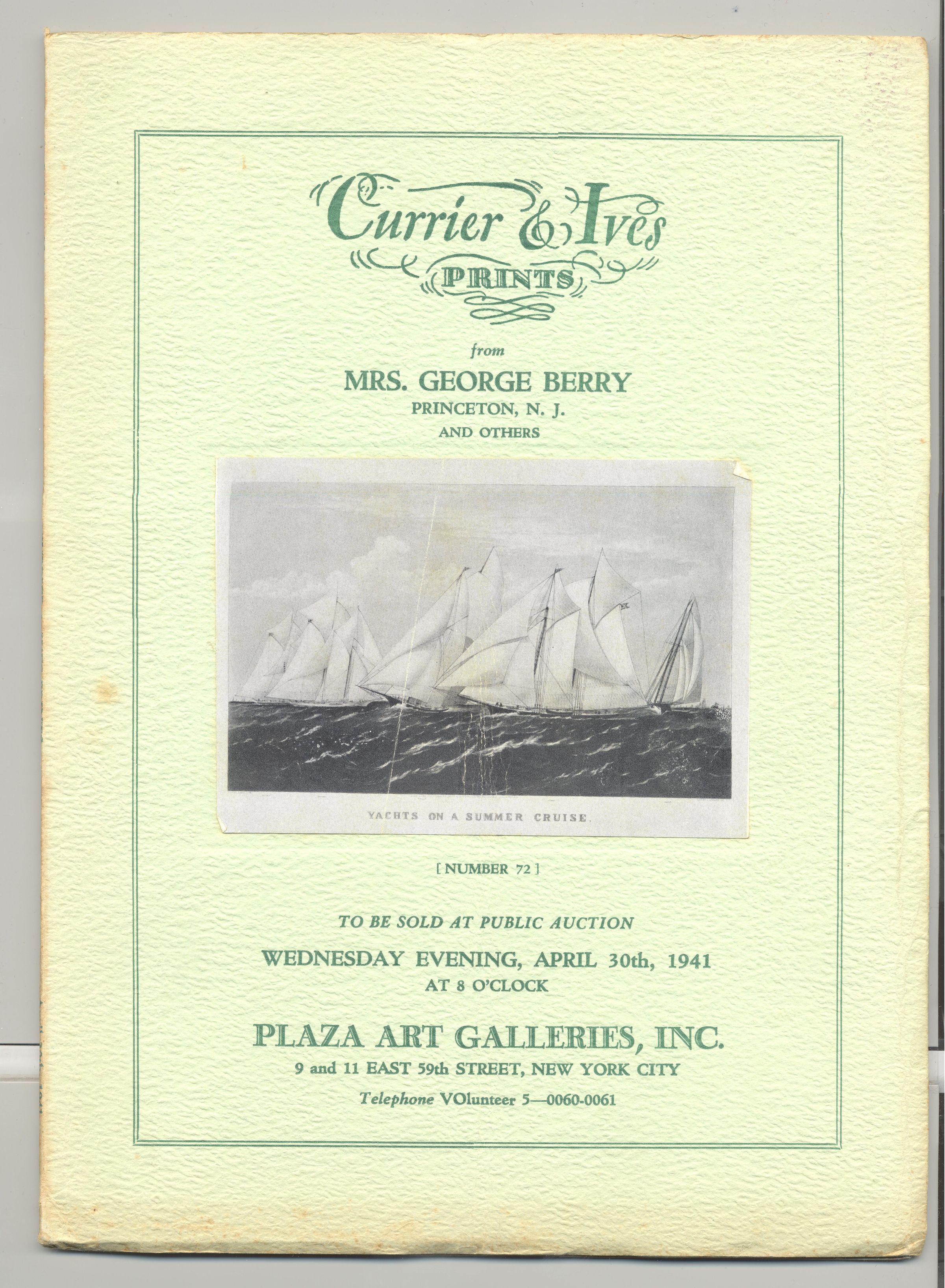 CAT, ART, 1941, NY. CURRIER & IVES PRINTS FROM MRS. GEORGE BERRY AND OTHERS. PLAZA ART GALLERIES, INC. APRIL 30, 1941. ILLUS, PRICED, 33 PP. 7 1/2" X 10"Created By