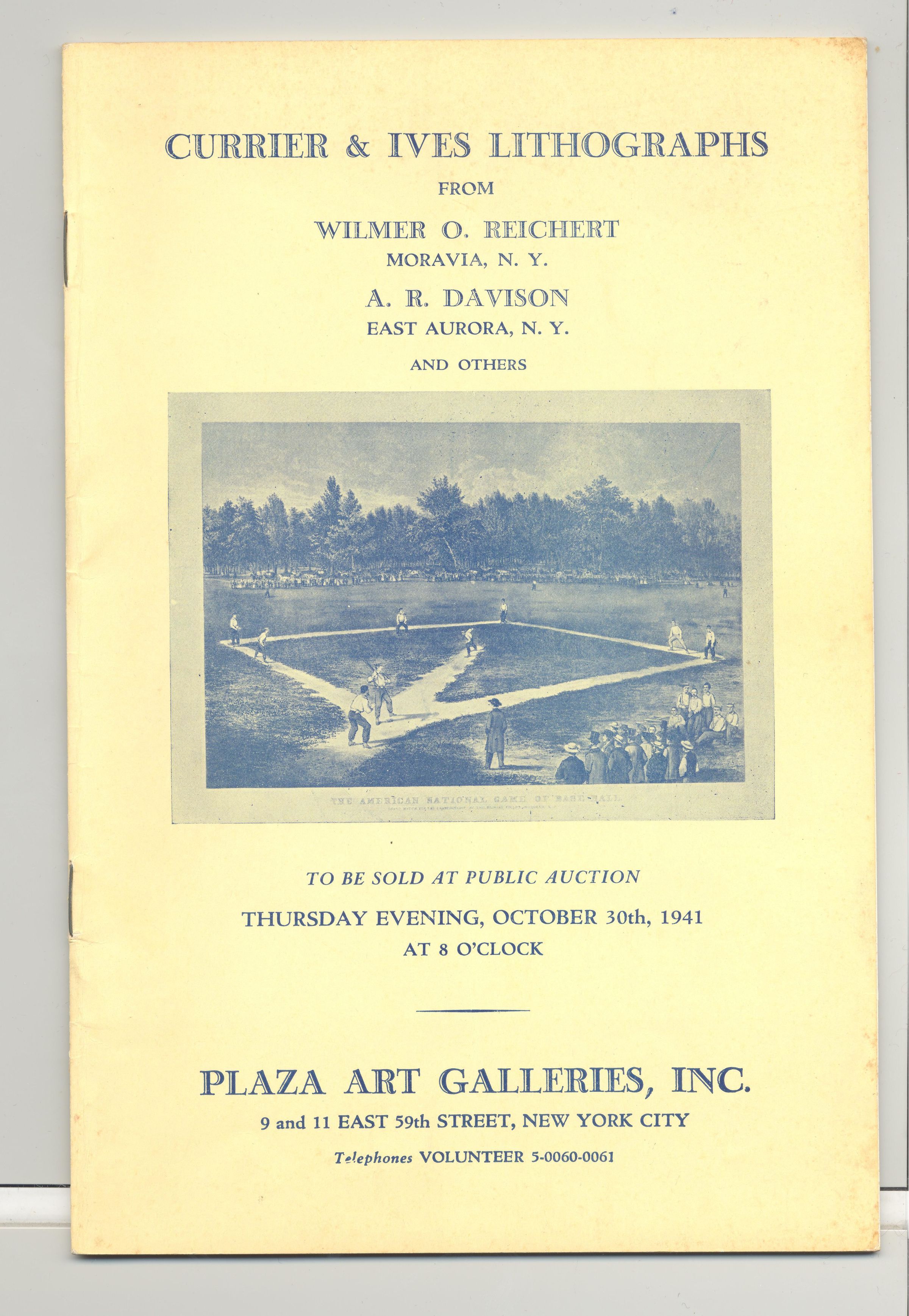 CAT, ART, 1941, NY. CURRIER & IVES PRINTS FROM WILMER O. REICHERT, MORAVIA, NY AND OTHERS. PLAZA ART GALLERIES, INC. OCT 30, 1941. 29 PP ILLUS, PRICED. 6" X 9"Created By