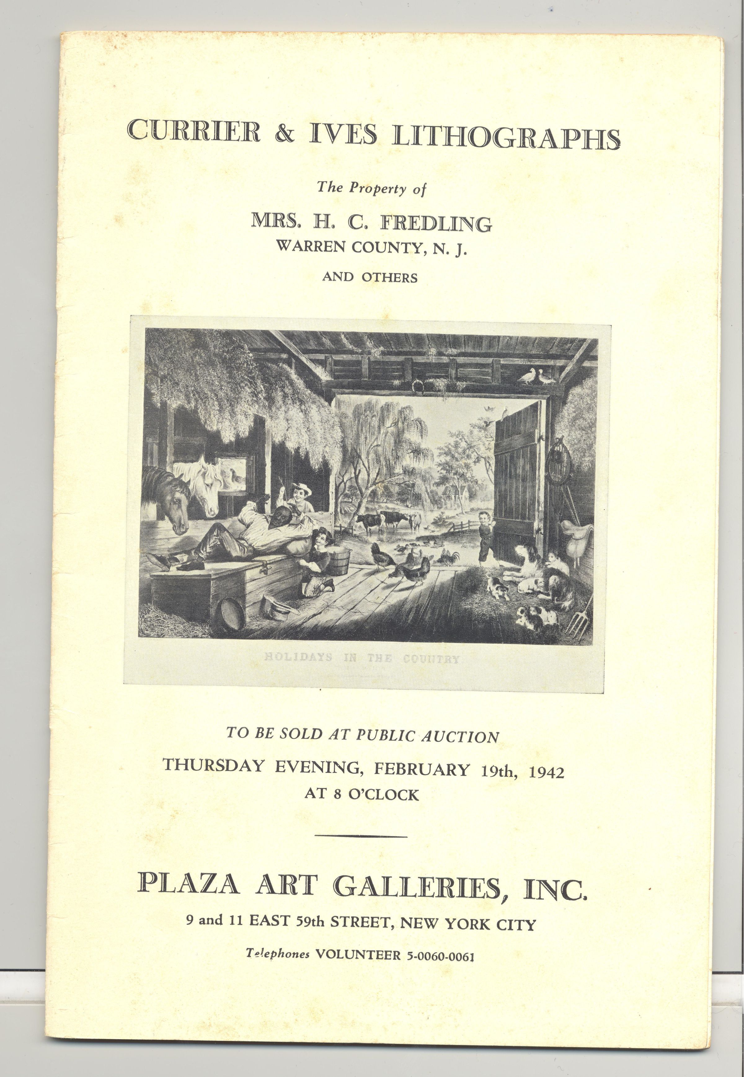 CAT, ART, 1942, NY. CURRIER & IVES LITHOGRAPHS. THE PROPERTY OF MRS. H.C. FREDLING. PLAZA ART GALLERIES, INC. FEB 19, 1942. 30 PP. ILLUS, PRICED. 6" X 9"Created By