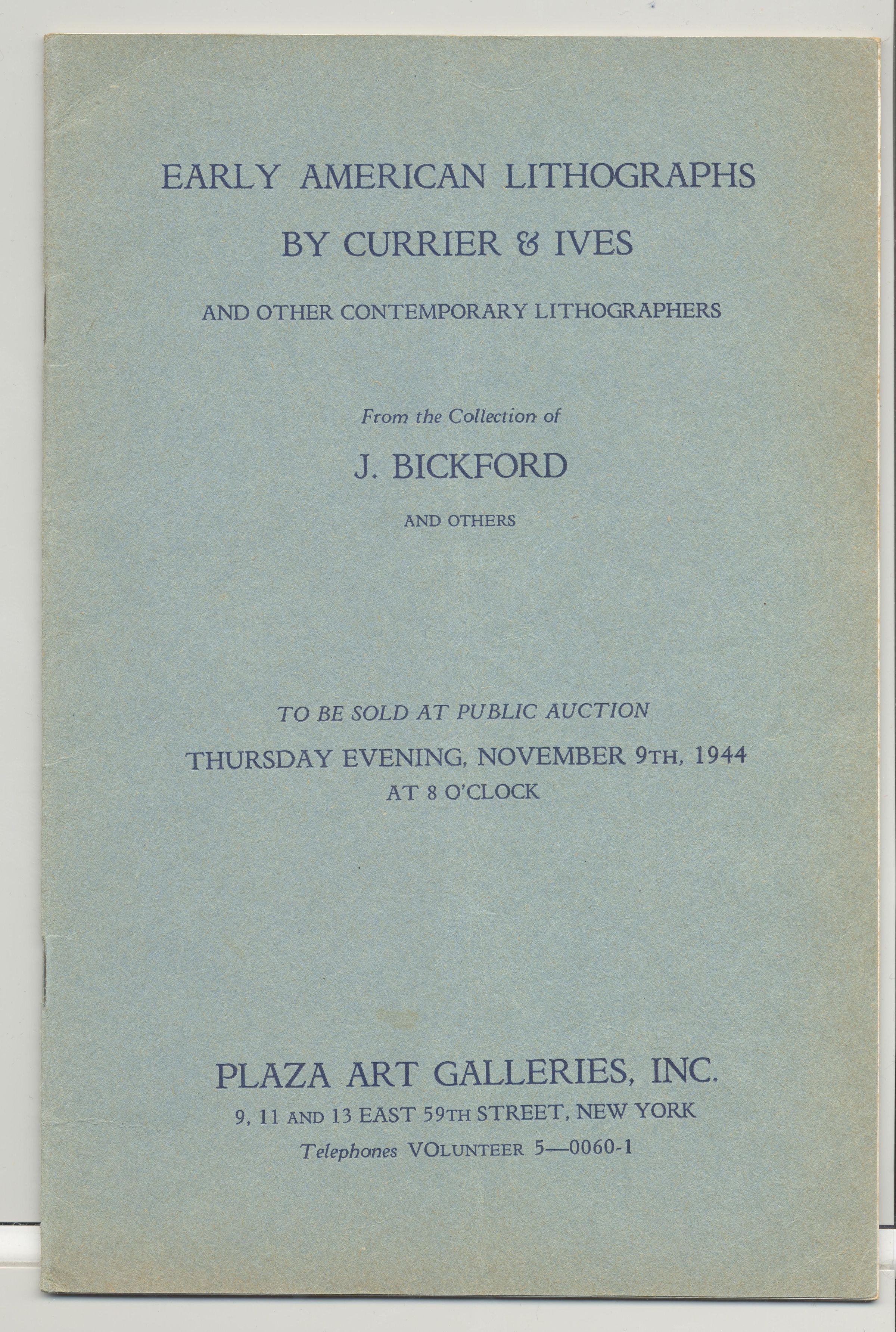 CAT, ART, 1944, NY. EARLY AMERICAN LITHOGRAPHS BY CURRIER & IVES AND OTHERS. PLAZA ART GALLERIES, INC. NOV 9, 1944. 21 PP, ILLUS, PRICED. 6" X 9"Created By