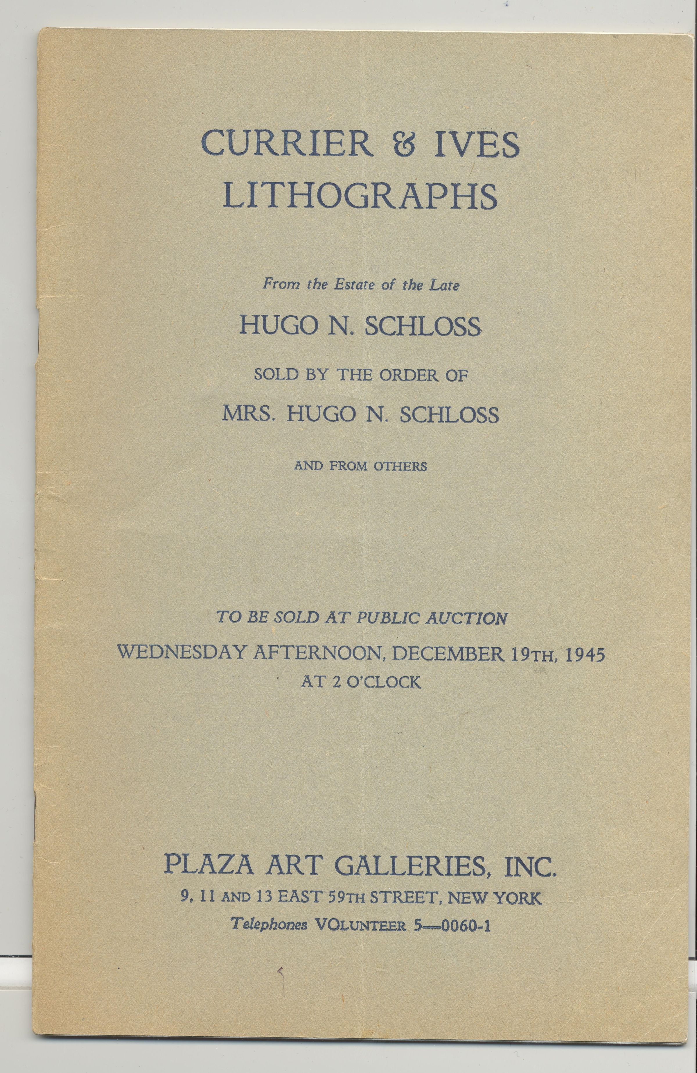 CAT, ART, 1945, NY. CURRIER & IVES LITHOGRAPHS FROM THE ESTATE OF MRS. HUGO N. SCHLOSS AND OTHERS. PLAZA ART GALLERIES, INC. DEC 19, 1945. 30 PP. ILLUS, PRICED. 6" X 9"Created By