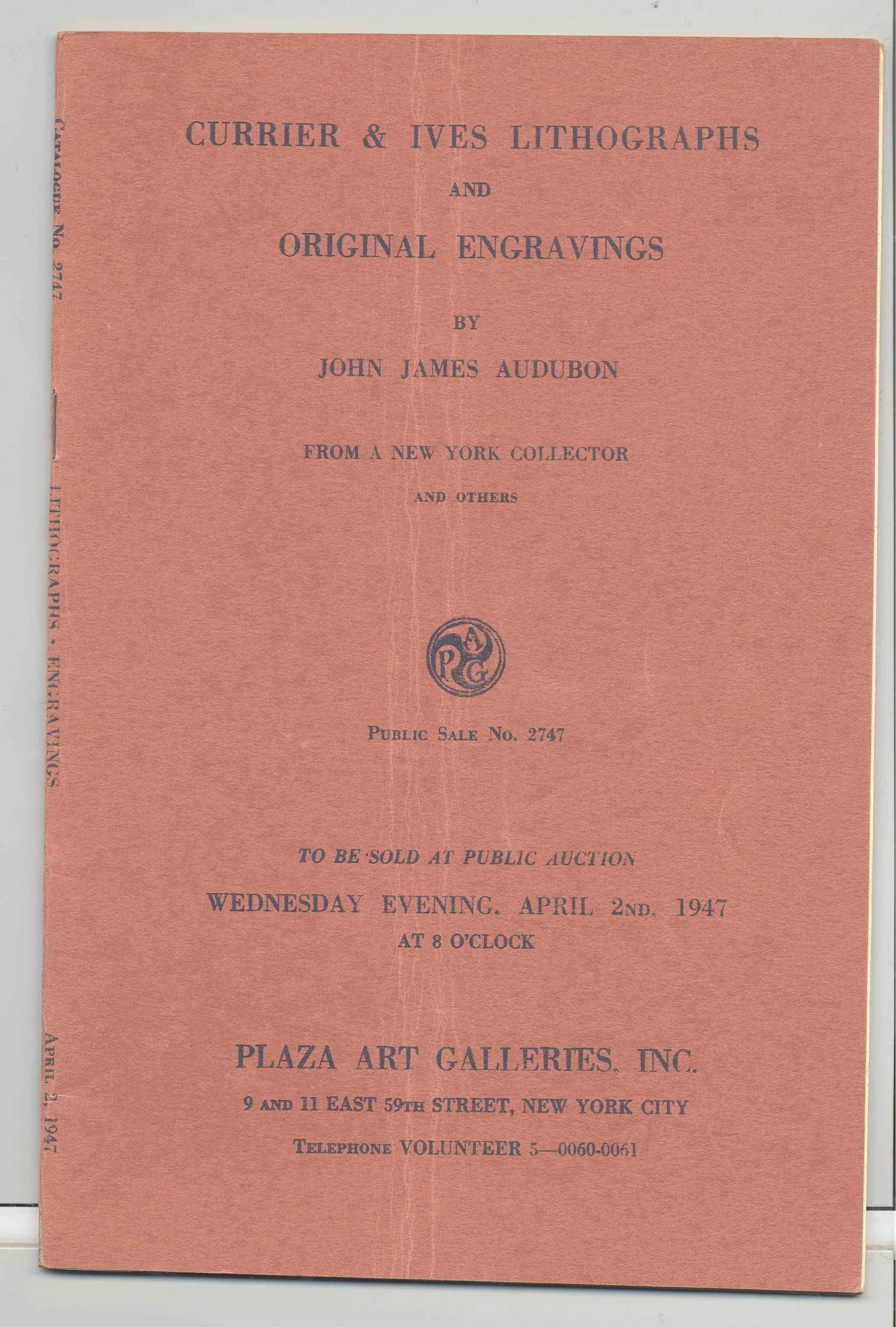 CAT, ART, 1947, NY. CURRIER & IVES LITHOGRAPHS AND ORIGINAL ENGRAVINGS BY JOHN JAMES AUDUBON. PLAZA ART GALLERIES, INC. APRIL 2, 1947. 36 PP, ILLUS PRICED. 6" X 9"Created By