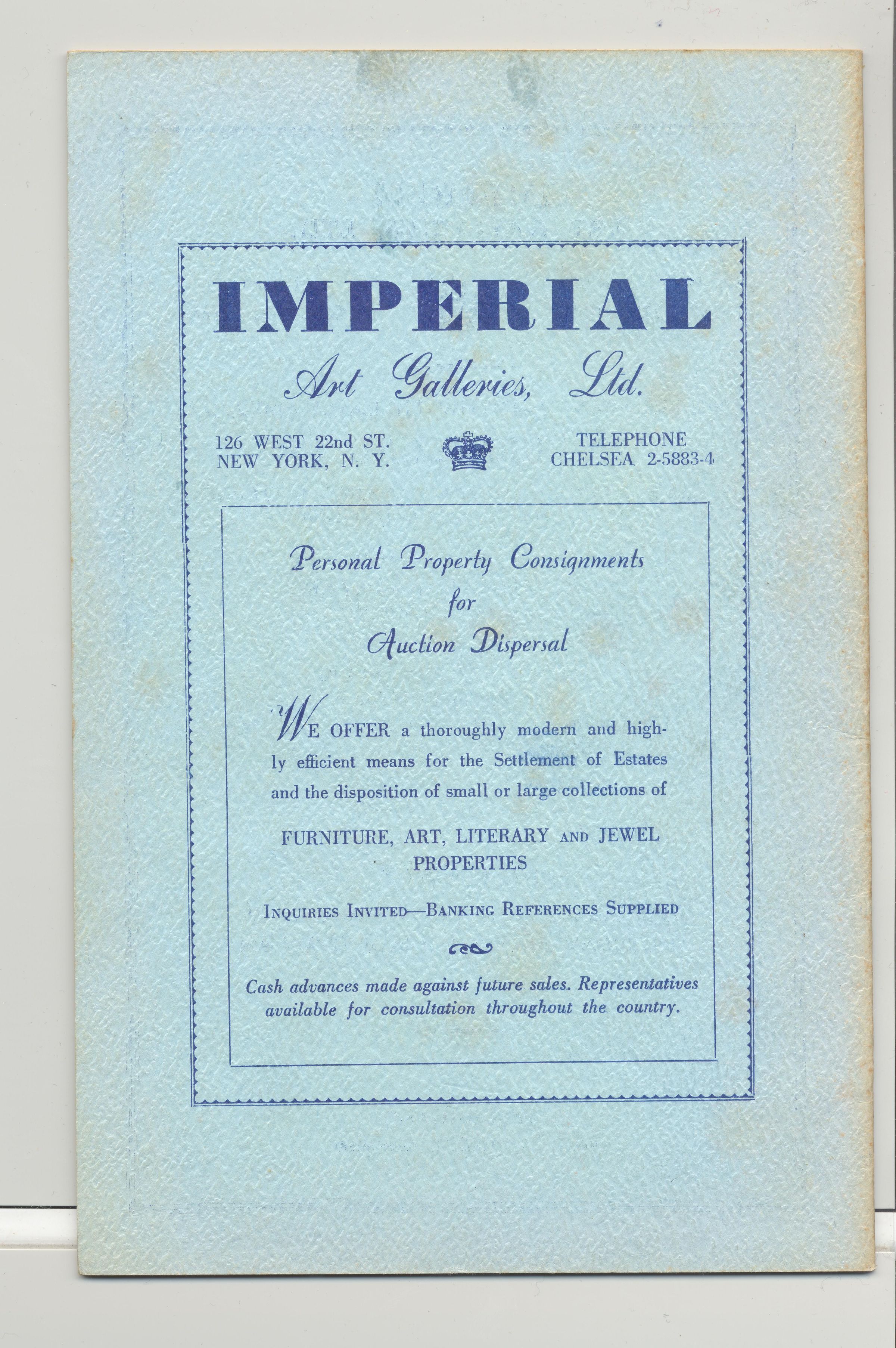 CAT, ART, 1940, NY. IMPERIAL ART GALLERIES, LTD. FURNITURE, ETCHINGS, MEZZOTINTS, ETC. MR. J. A. MILLER, AUCTIONEER. 18 PP PRICED. 6" X 9"Created By