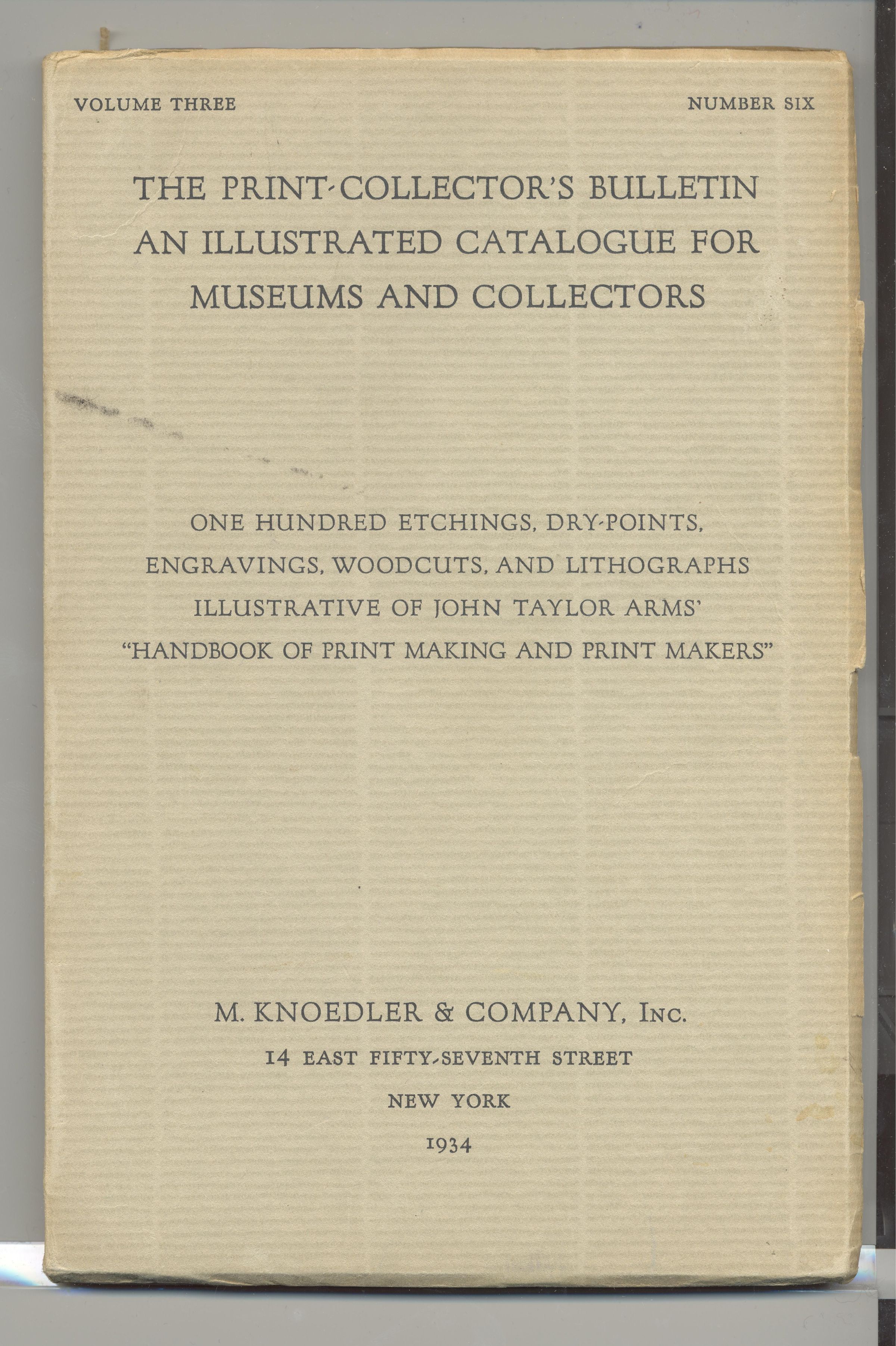 CAT, ART, 1934, NY. THE PRINT-COLLECTOR'S BULLETIN, AN ILLUSTRATED CATALOGUE FOR MUSEUMS AND COLLECTORS. VOL 3, NO. 6. ONE HUNDRED ETCHINGS, DRY-POINTS, ENGRAVINGS, WOODCUTS AN LITHOGRAPHS. M.KNOEDLER & CO, INC. 132 PP, ILLUS. 6" X 9"Created By