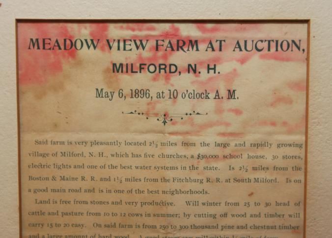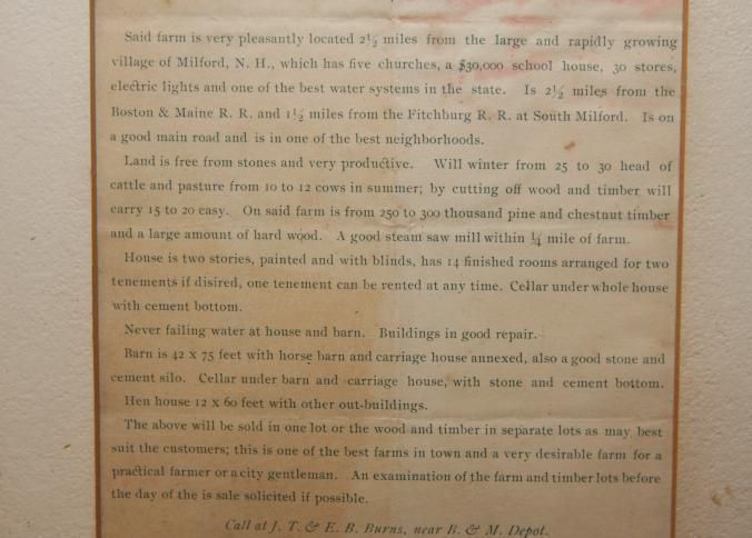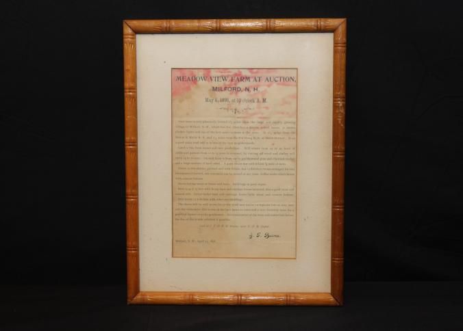 FR. 1896 NH FARM AUCTION BROADSIDE. 5X7". THIS AUCTION COMMENCING AT 10AM IS A COMPLETE LIQUIDATION INCLUDING REAL ESTATE. FARM LOCATED IN MILFOR, NH. GREAT DETAIL ON PERSONAL AND REAL PROPERTY TO BE SOLD.Created By