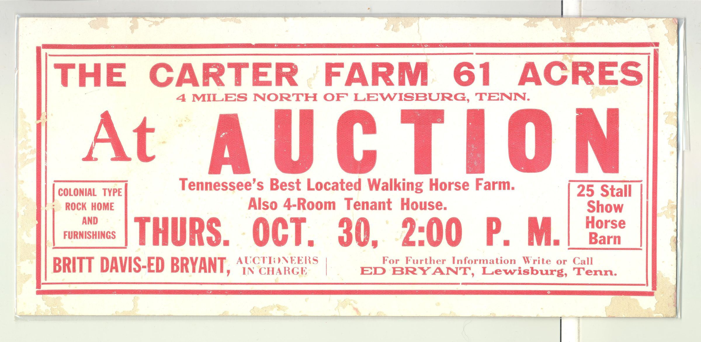 ADVERTISING BLOTTER, FARM, TN. THE CARTER FARM, 61 ACRES AT AUCTION. BRITT DAVIS-ED BRYANT, AUCTIONEERS IN CHARGE. 10 1/4" X 4 3/4"Created By