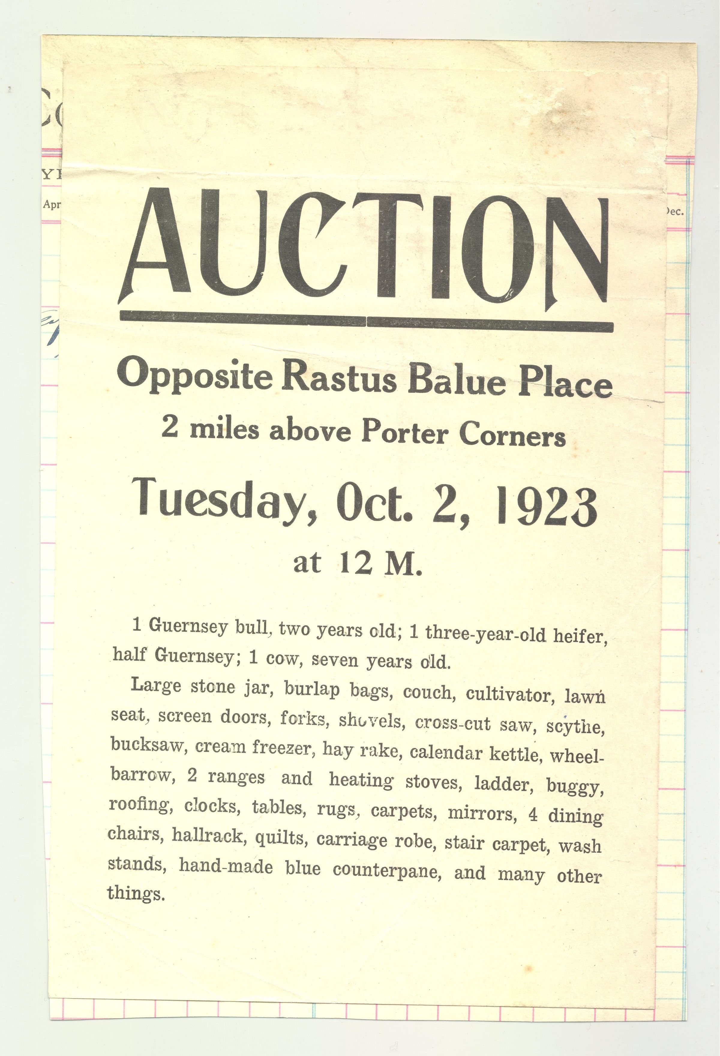 ADVERTISING FOR AUCTION, OPPOSITE RASTUS BALUE PLACE, 1923. LIVESTOCK, HOUSEHOLD. 5" X 8"