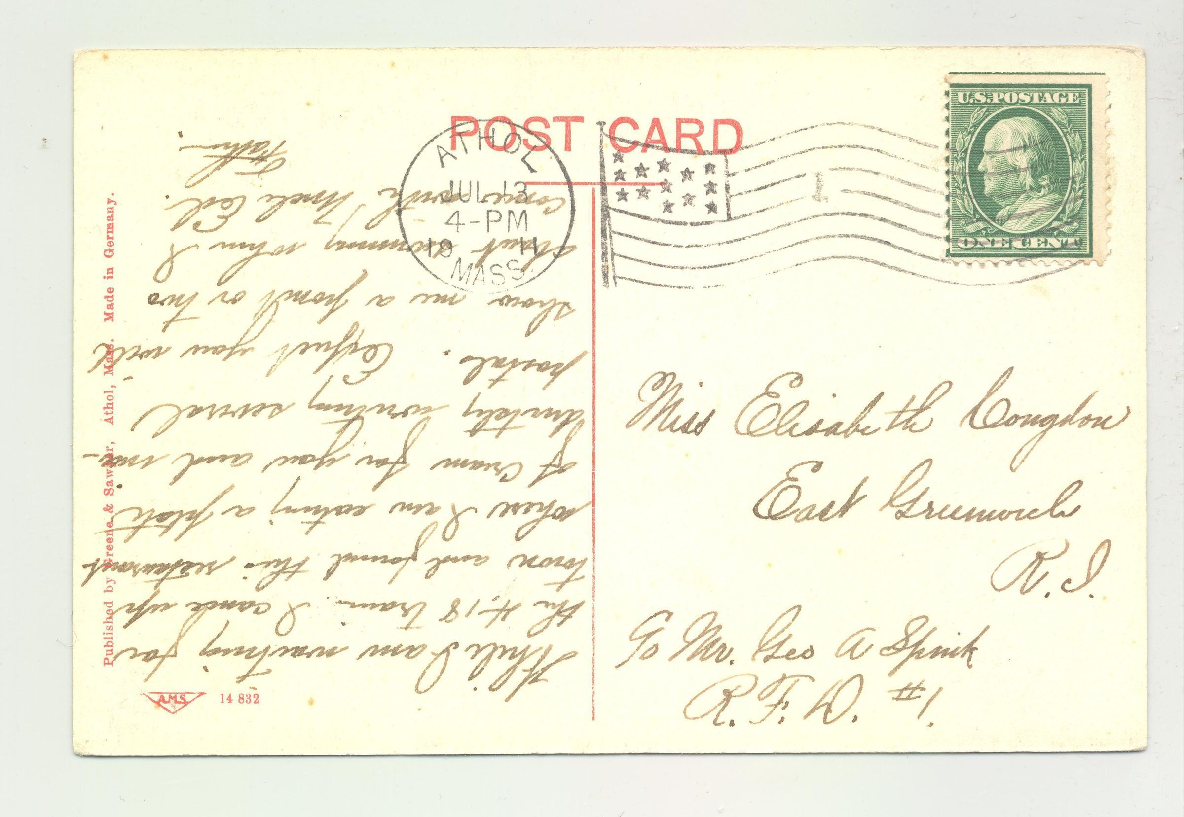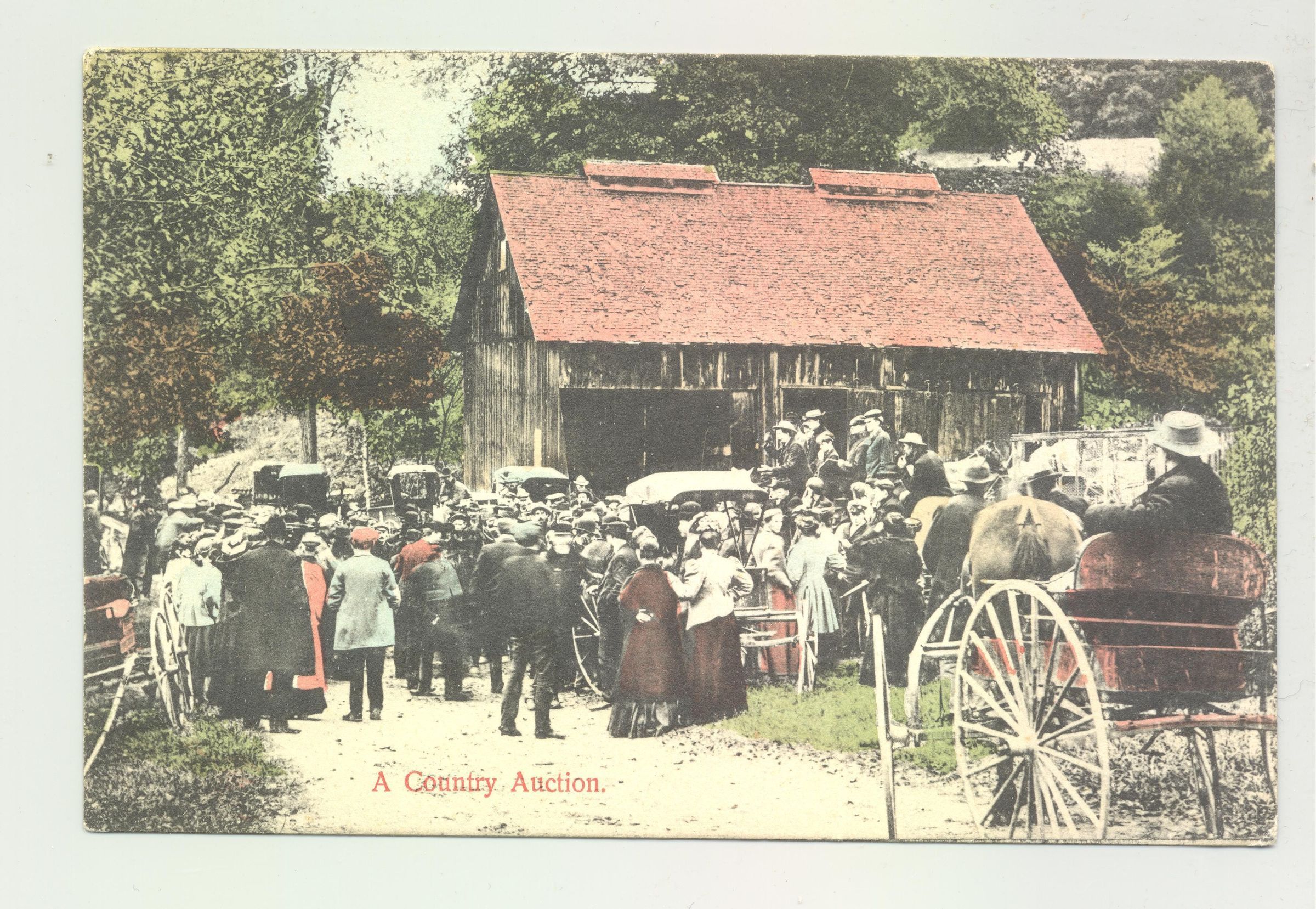 PSCD, 1914, MA. A COUNTRY AUCTION. COLORED PRINT OF BARN AND CROWD.
