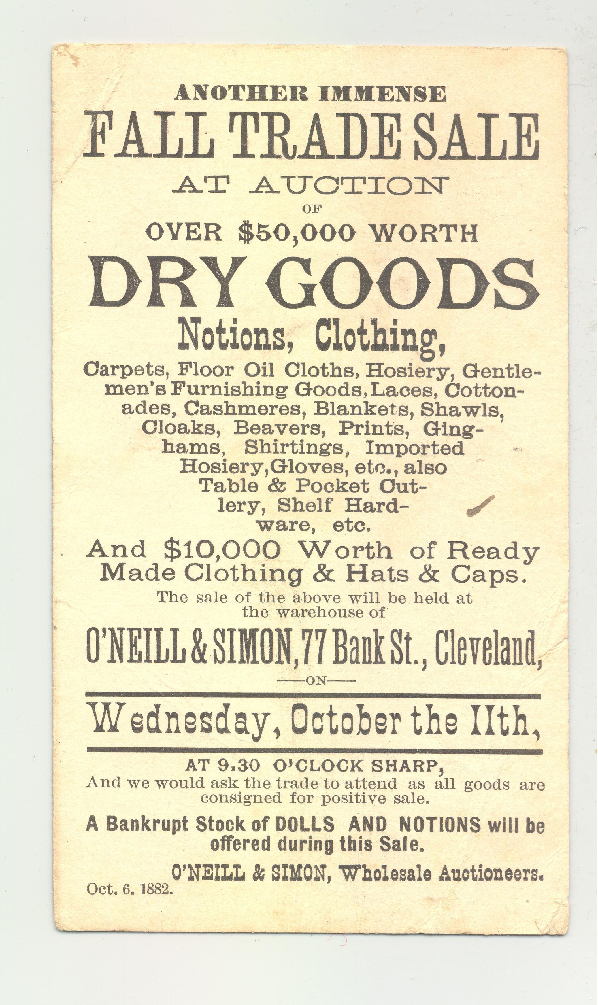 PSCD, 1882, OH. ANOTHER IMMENSE FALL TRADE SALE AT AUCTION OF OVER $50,000 WORTH DRY GOODS. O'NEILL & SIMON, WHOLESALE AUCTIONEERS.Created By