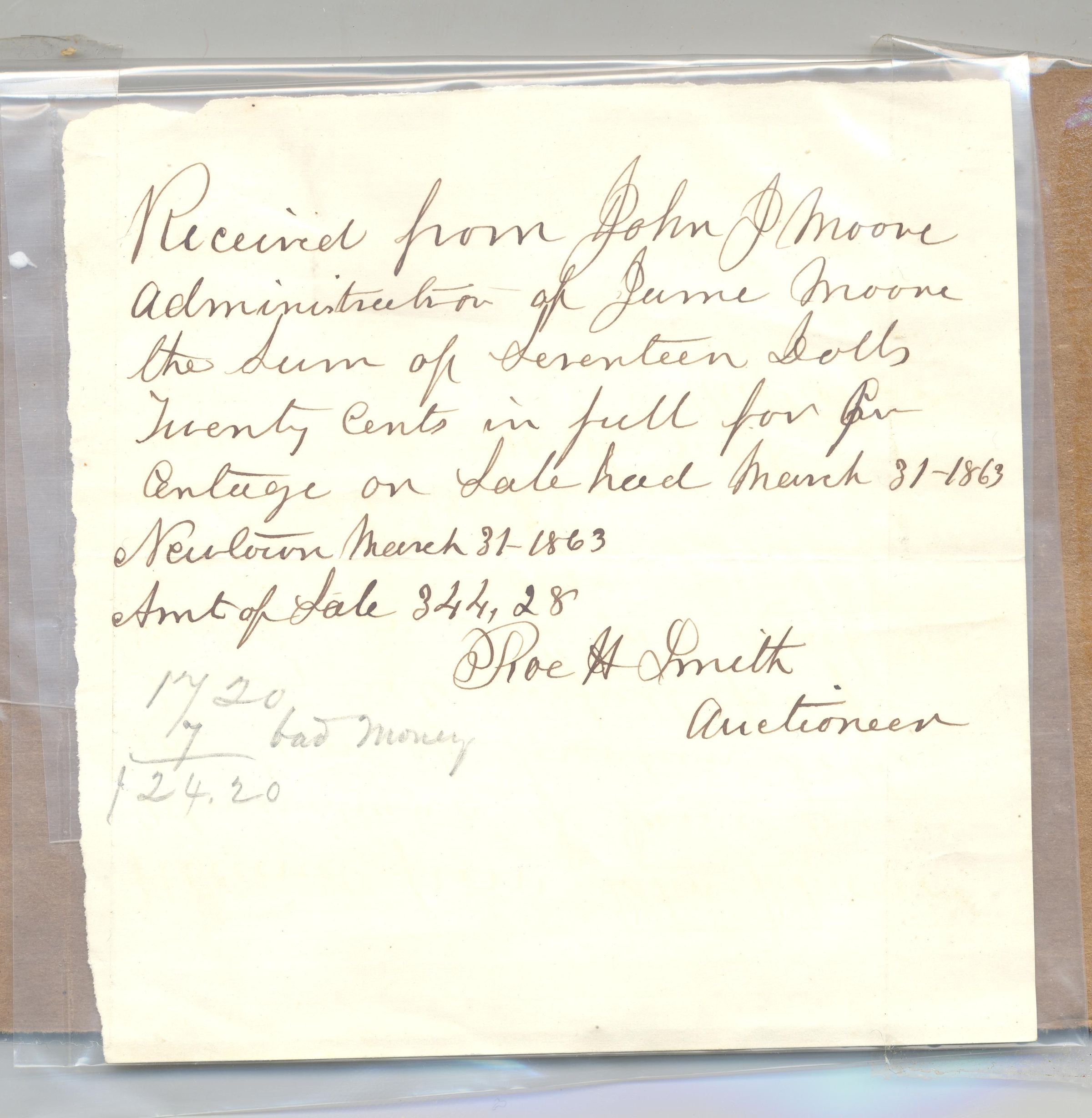 DOC, RECEIPT, 1863, NEWTOWN. ROE H. SMITH, AUCTIONEER. 5" X 5"