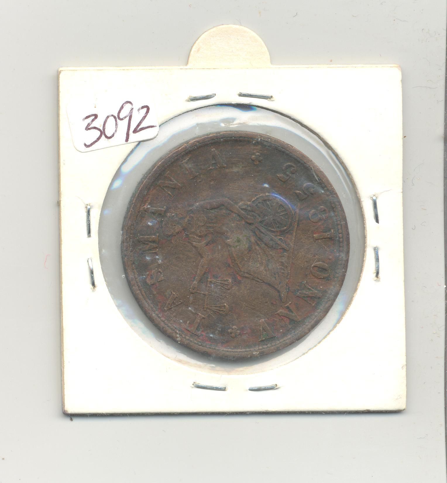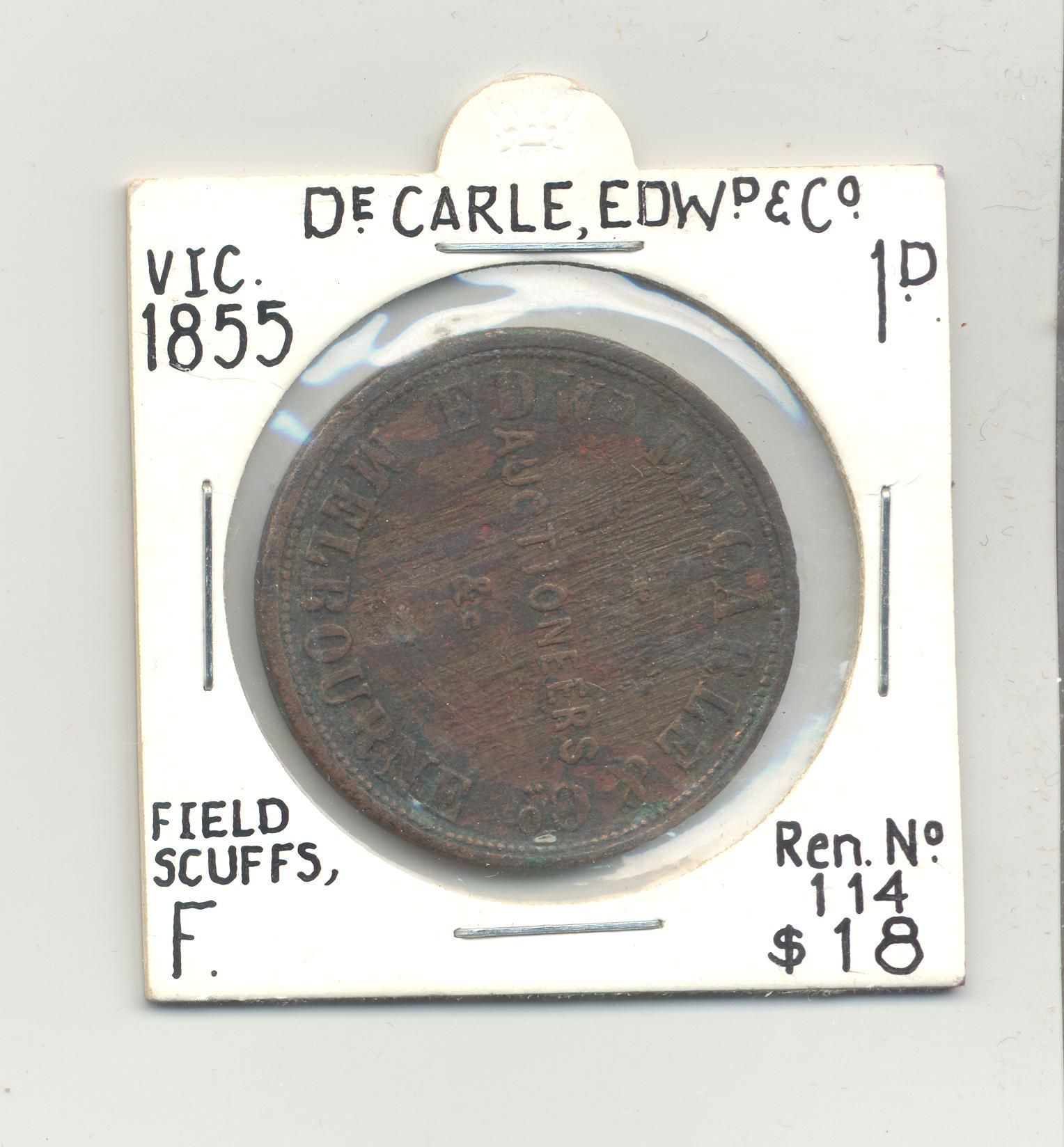 ADVERTISING COIN, EDWD. DE'CARLE & CO. MELBOURNE. AUCTIONEERS. TASMANIA, 1855. 1 1/4" DIA.