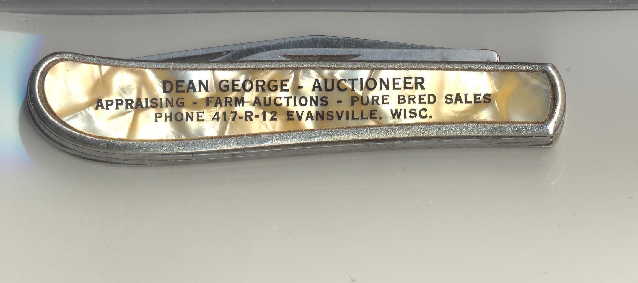 ADVERTISING POCKETKNIFE, MOTHER OF PEARL HANDLE. DEAN GEORGE, AUCTIONEER, EVANSVILLE, WI. 3" CLOSEDCreated By