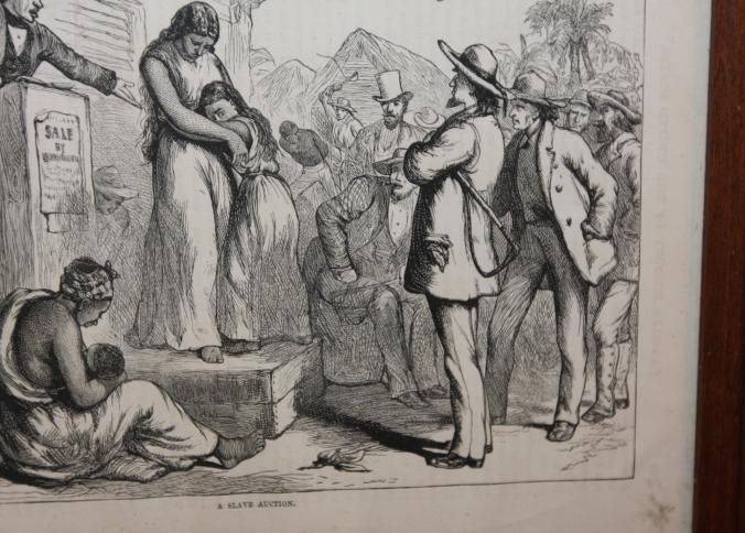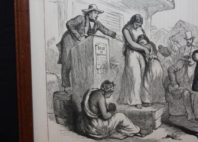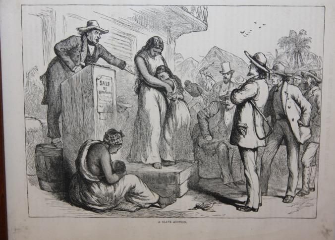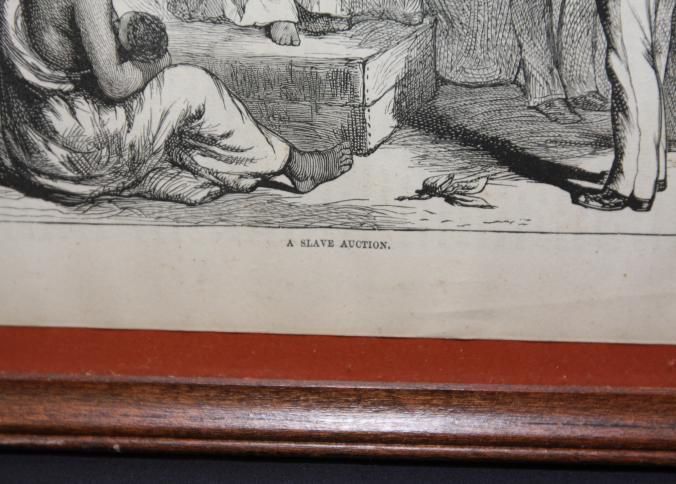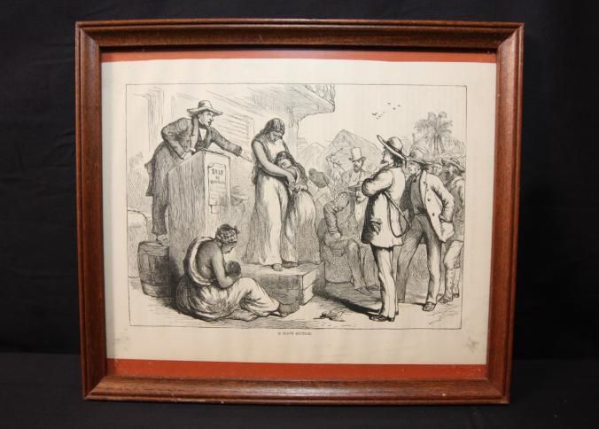 FR. 19THC ENGRAVING "A SLAVE AUCTION". 6X8 1/2". FABULOUS GRAPHICS OF AUCTION IN PROGREE, INCLUDING - AUCTIONEER, AUCTION BLOCK, MOTHER AND CHILD, CROWD, SLAVES IN FOREGROUND AND BACKGROUND.Created By