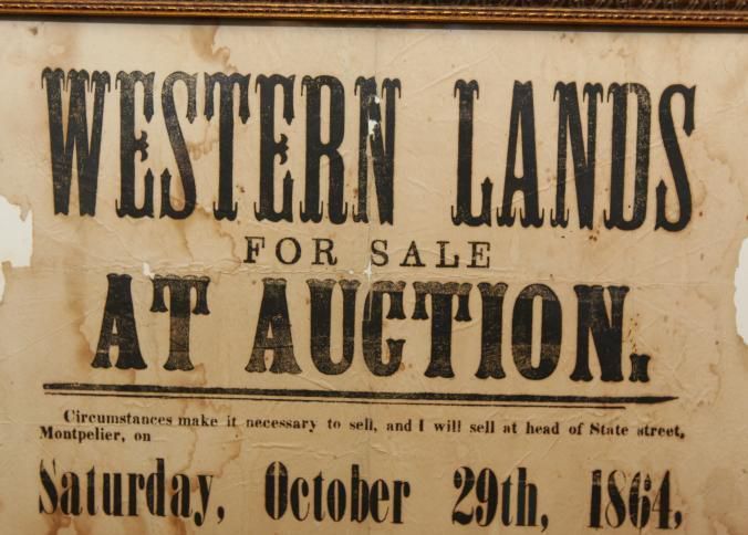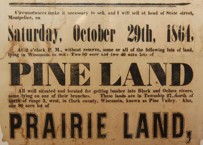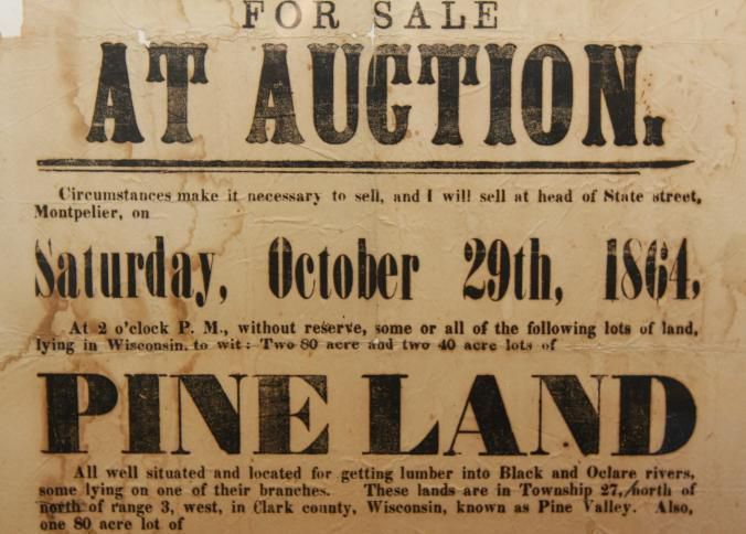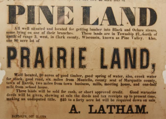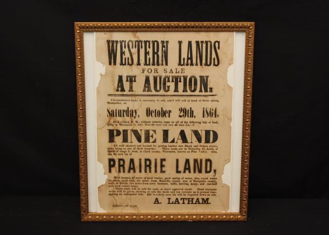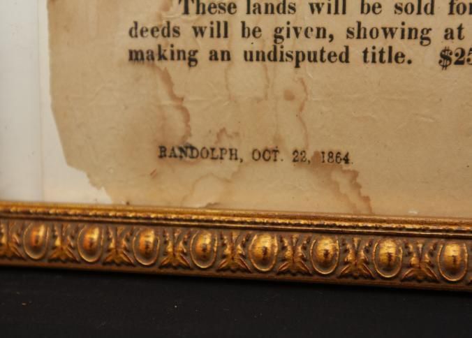 FR BROADSIDE, LAND, 1864, RANDOLPH. WESTERN LANDS FOR SALE AT AUCTION. PINE LAND, PRAIRIE LAND. SIGNED A. LATHAM. 14 1/2" X 16"Created By