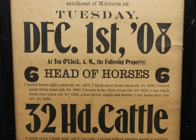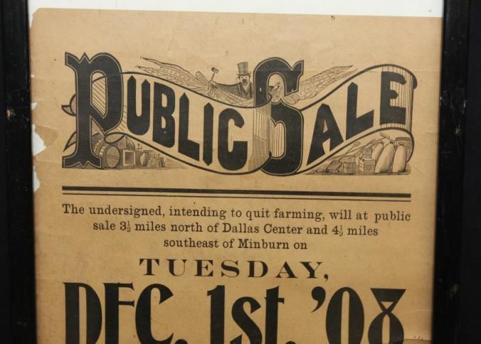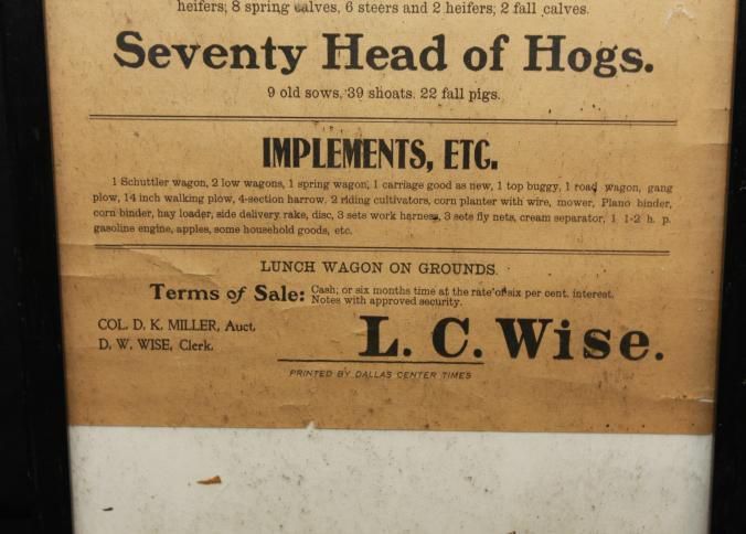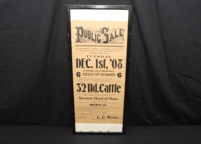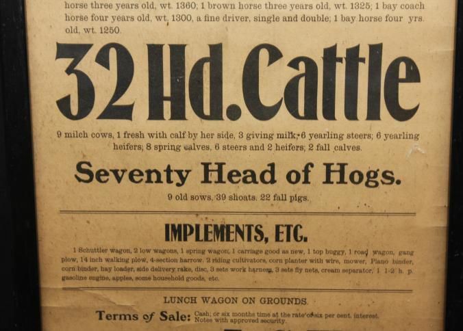 FR BROADSIDE, LIVESTOCK, FARM EQUIPMENT, 1908, TX. PUBLIC SALE 6 HEAD OF HORSES, 32 HD. CATTLE, 70 HEAD HOGS, IMPLEMENTS, ETC. COL. D.K. MILLER, AUCTIONEER. 12 3/4" X 27 1/2"Created By